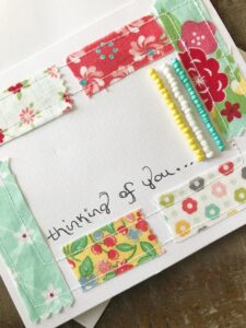 I’ve been writing letters the last couple weeks and mailing to some of my elderly friends that are shut-in right now. It can’t be easy being elderly and not being able to get out or have visitors. So I thought… how about a simple little home made card with some fabric scraps and beads?