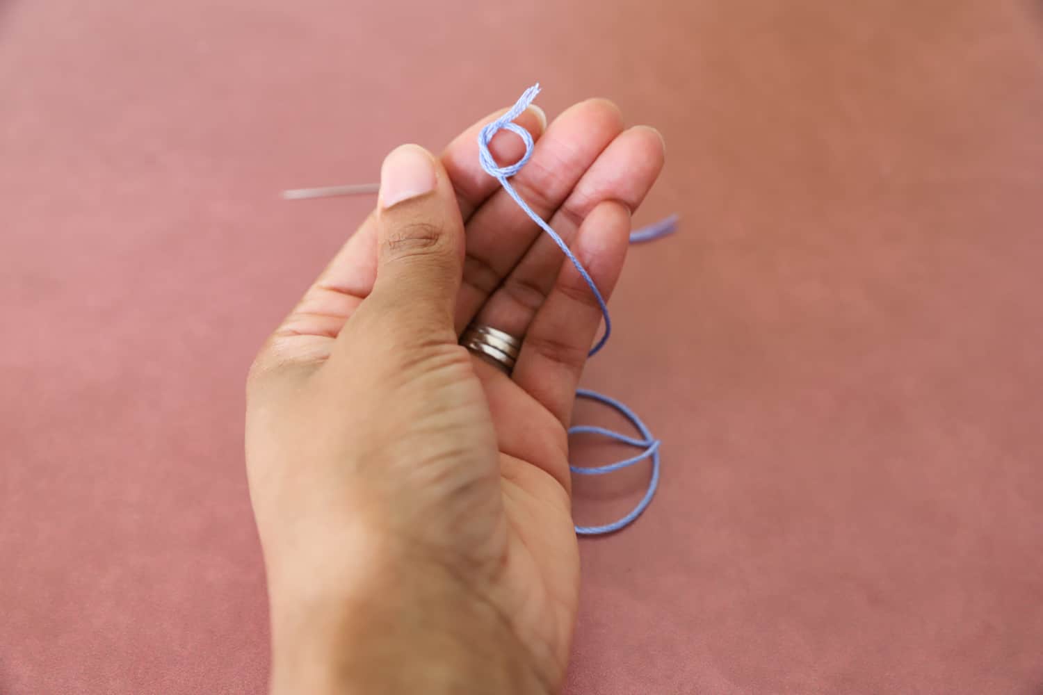 Pull the embroidery floss until you have a loop, then push the needle through on the blue line.