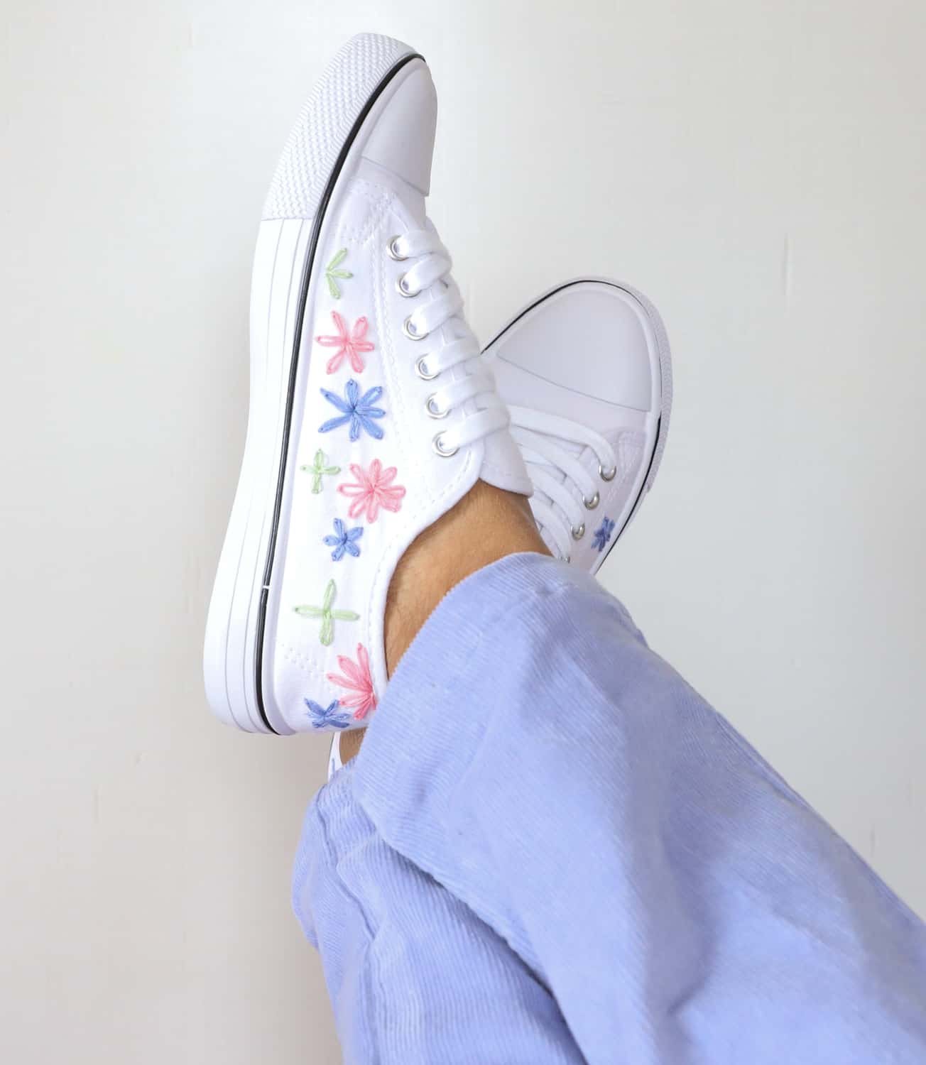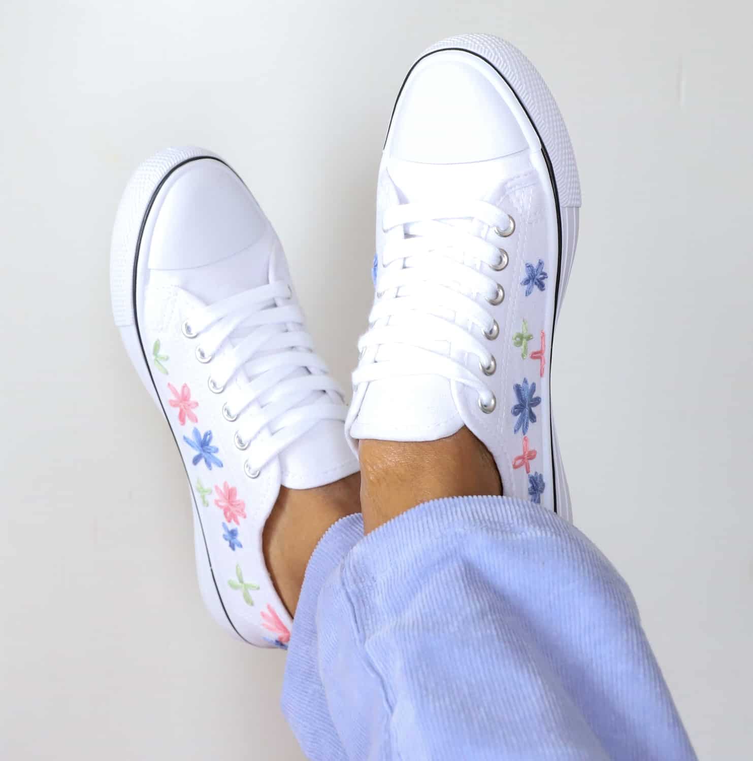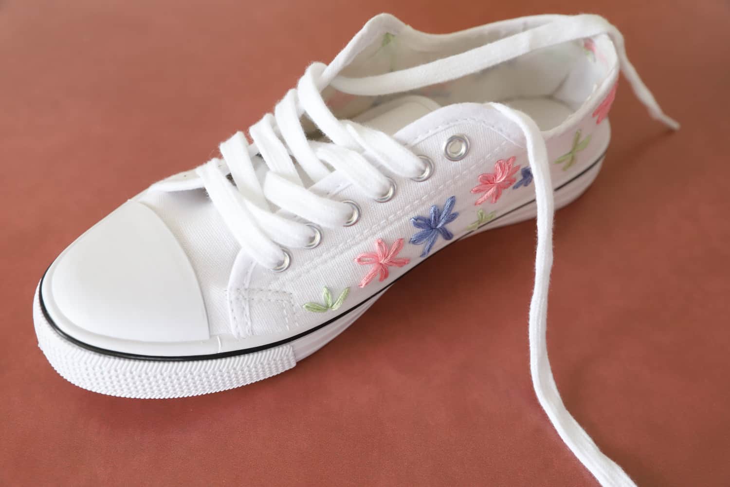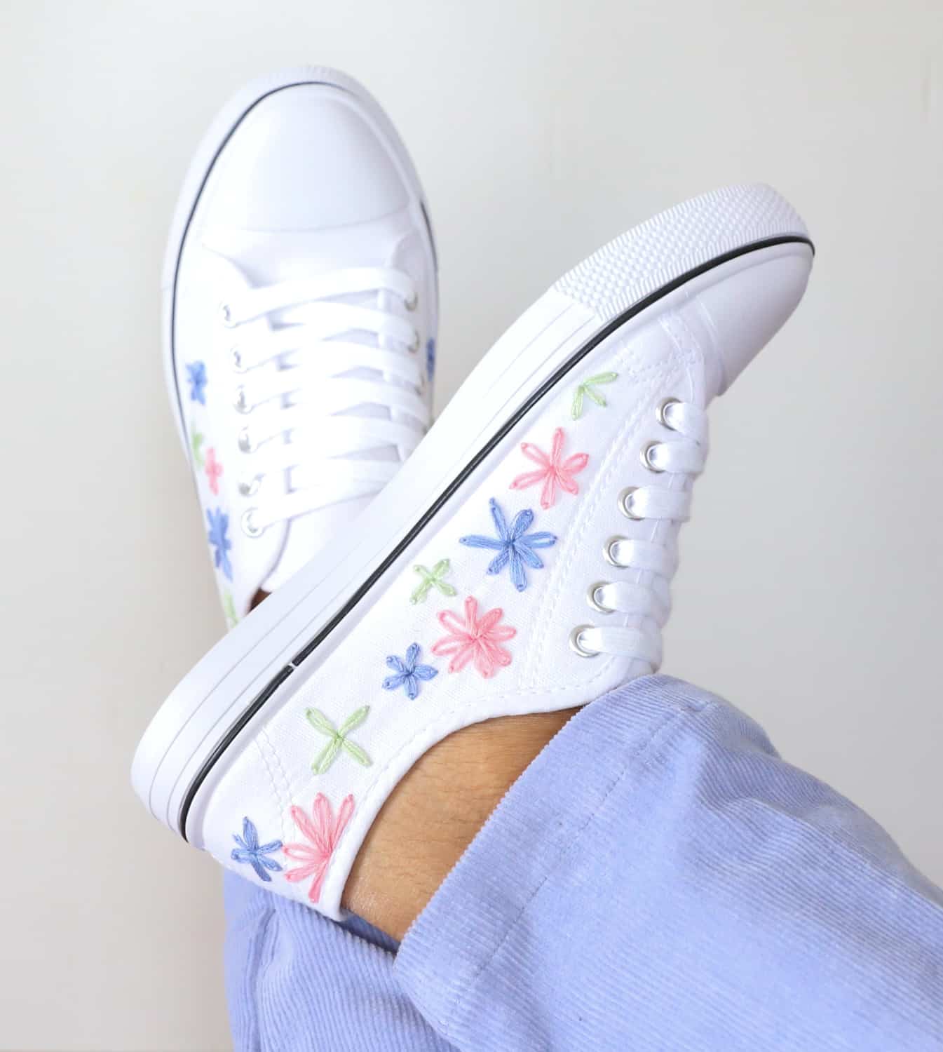 This month, I will be sharing how to create hand-embroidered shoes using the lazy daisy embroidery stitch. Stitching on shoes can be somewhat intimidating, but this tutorial will guide you step-by-step throughout the process. I like that the lazy daisy stitch isn’t overly complicated and it can be used to upcycle clothing. So, are you ready to step into 2022 with some stylish shoes? If you are, let’s get started!