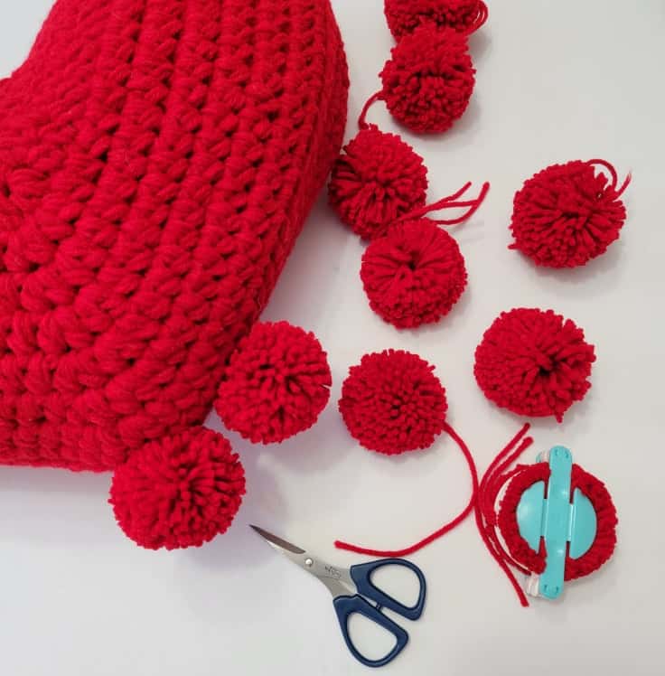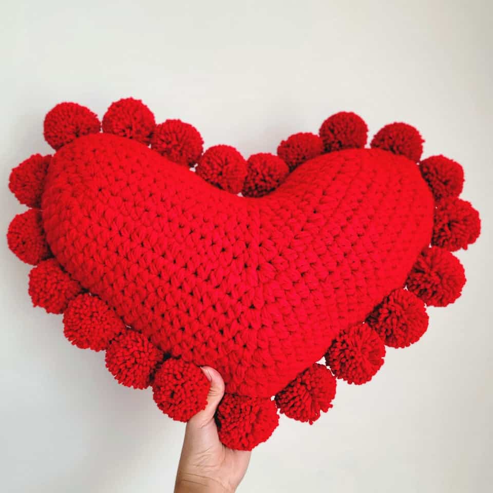 Optional: Make some pompoms and attach them around your heart cushion. I made and attached 20 pompoms around my heart cushion.