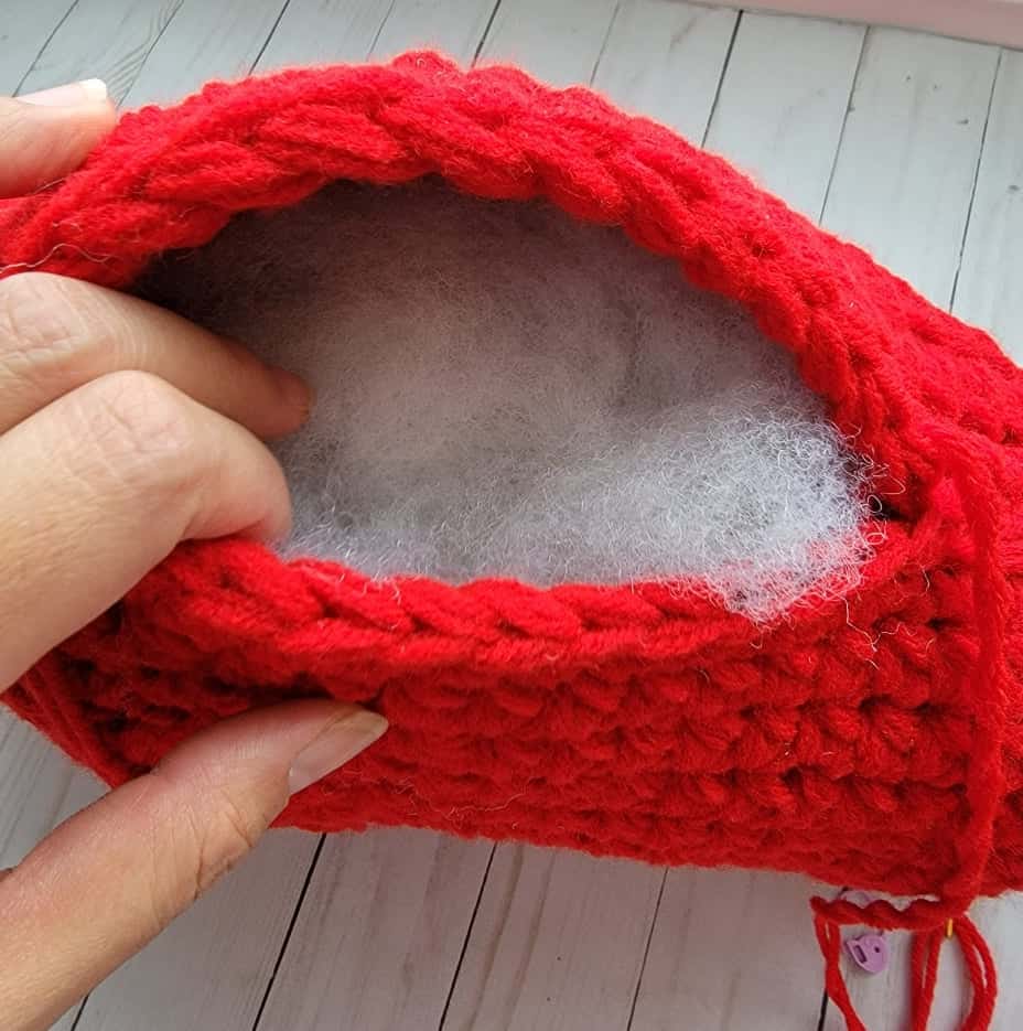 I have a few skeins of red worsted weight yarns in my stash for years now. I didn’t know what to make with them until it dawned on me that by using them together – 4 strands held together, I can turn these worsted weight yarns into a super bulky or jumbo weight. This way, it would be faster to finish my project. With that being said, different yarn weights will give different dimensions for your project.