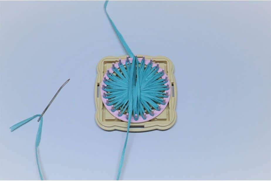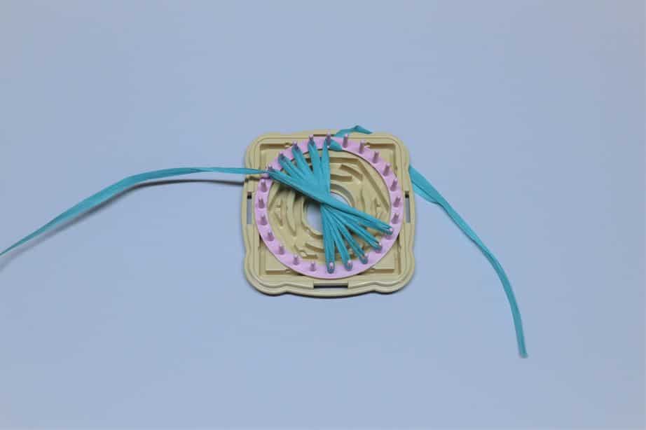 Following the same instructions as before, create two more flowers, one from the smallest pink loom, and one from the circular blue loom. For an added visual interest, the midsized flower may be created using a contrasting color yarn. Finish all flowers in the same way, careful not to cut the tails.