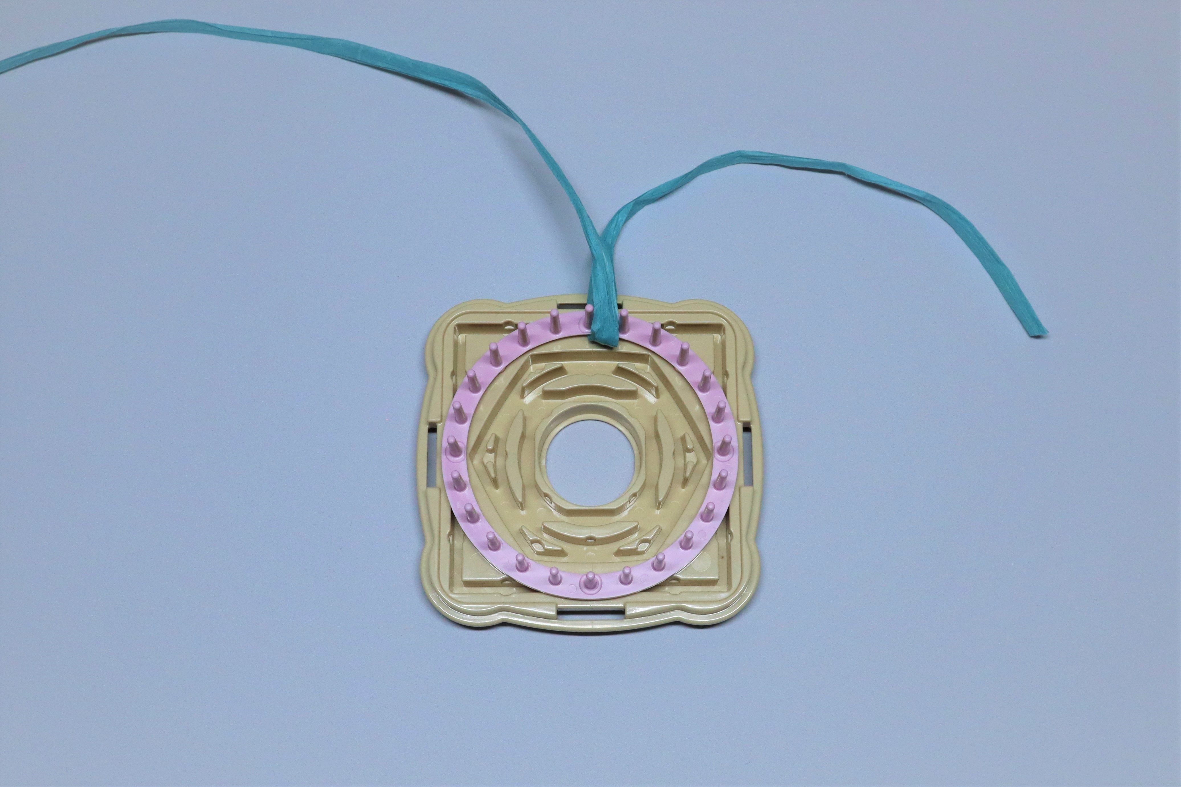 Begin by locking the largest circle loom for the Hana-Ami Flowers in place. As you lock it in place, loop the end of your raffia yarn under the circle to keep it tucked securely out of the way. Leave about 4-5” of the tail. Following the photos below, begin wrapping your yarn around every peg of the loom moving in a counter-clockwise motion. Keep your tension tight, and be sure to match up pegs evenly to the peg directly across from it on the loom. Continue wrapping until you have returned to the first loop.