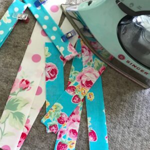 There are numerous little binding strips for this Cosmetic Pouch and I got them ironed nicely and used Clover Wonder Clips to hold in place the little handle pieces after I ironed them. I think the Clover Wonder Clips just might be my most used tool…. I always have them at the ready!
