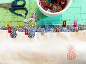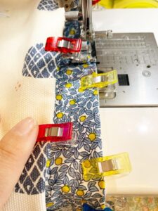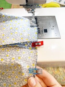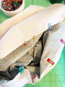 Join both fabrics with right sides together and wrong sides showing. Use Wonder Clips to join seams, sew around top edge leaving a four inch section open for turning.