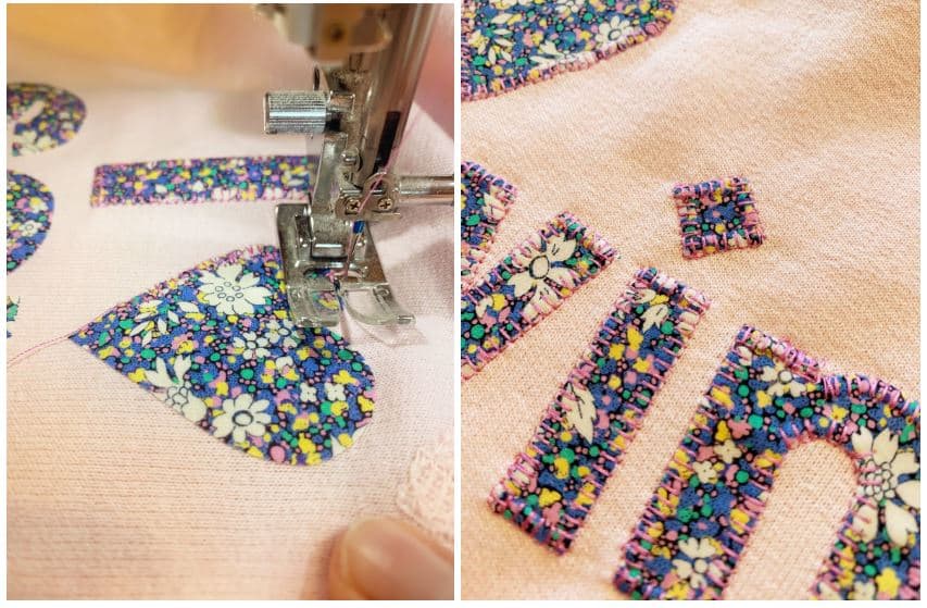 You are now ready to stitch the letters in place. I decided on a pink coordinating thread and a blanket stitch set to 4.0×2.50. Another idea is a zig-zag stitch or a straight stitch if you like the look of more raw edges that will fray over time. This part went much quicker than I had thought, even taking my time to go slowly around the curves and lifting my presser foot, and turning the sweatshirt. Be sure to backstitch or lock in your stitches at the end of each letter so they don’t unravel.