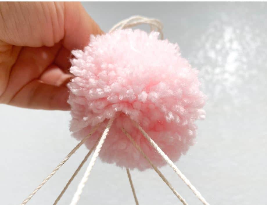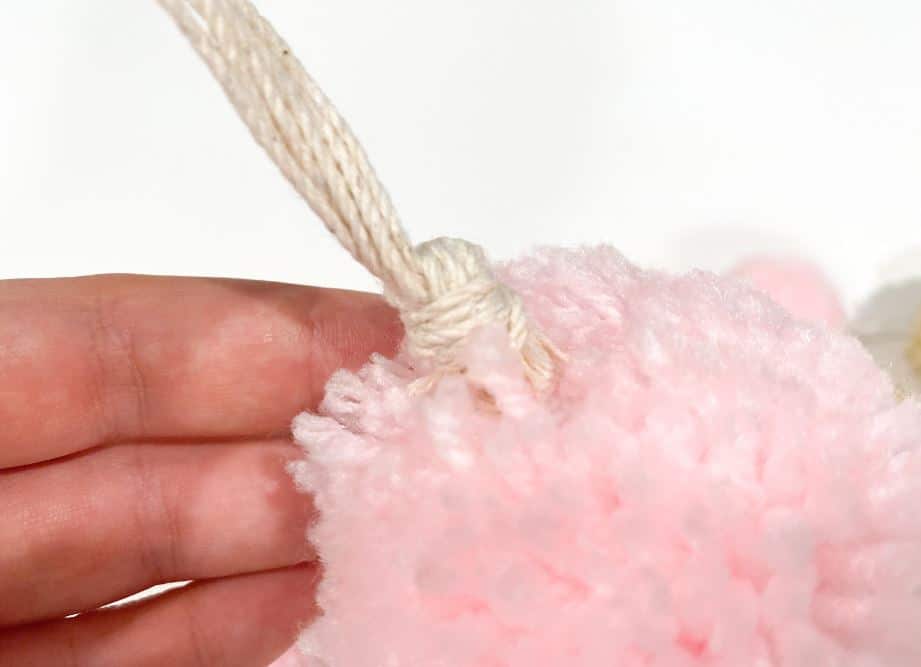 Step 5: Alternate the length of each string of pom poms by tying them 1 inch away from the hoop and then 3 inches away from the hoop. Leave a foot of string remaining. Then, evenly space each string out.
