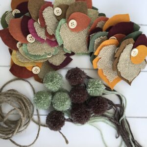 Step Eight: Lay your pompoms, beads (if you choose to use them), and felt leaves out on the table in a manner that is pleasing to you. You might want to play around with the order a few times to get the way you like.
