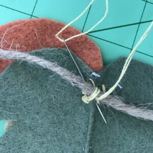Step Nine: Once you are happy with your layout, attach everything to the twine. You could use hot glue for this part but I’m not a fan of hot glue so here is how I did it: I threaded my beads through the twine, tied each pompom to the twine using the long yarn pieces (trim them after you are satisfied with placement), and I used the same needle and thread to simply hand stitch each leaf to the twine. You won’t need to use too many stitches for it to attach securely.