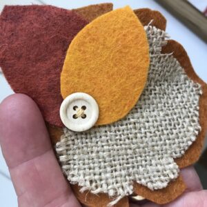 Step Four: Thread your Clover sashico needle with the embroidery thread. (I prefer the Sashico needle because it has a large eye and makes it very easy to thread, and has a sharp point.) Put a knot in the end of the thread and starting from the back of the leaf, use several simple stitches to attach the main leaf, burlap leaf, and two oval leaves together to form one piece. Don’t worry too much about how your stitches look – they will be covered with a button. Mainly you just want to make sure they are secured together.