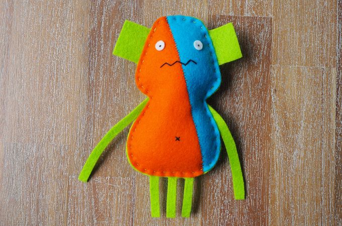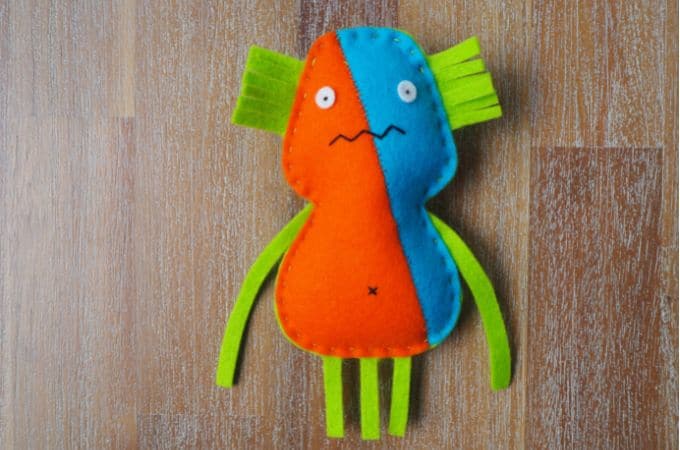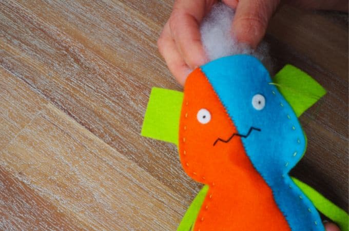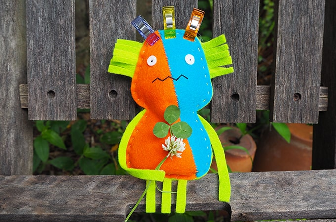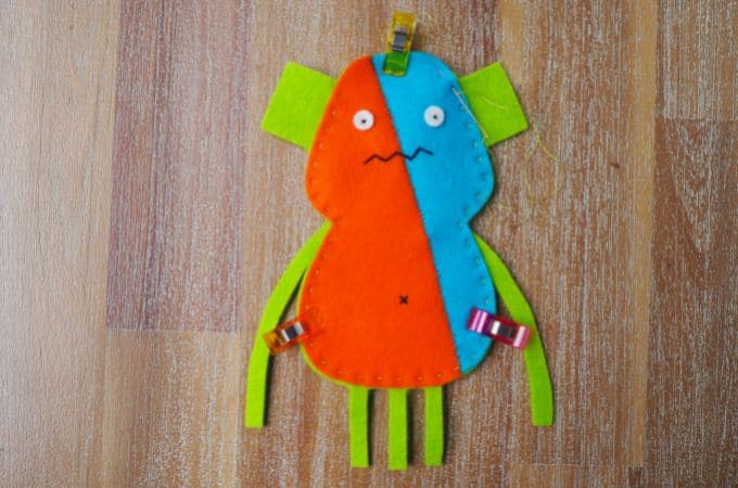 Download the templates here. Trace and cut out the back of Millicent’s body from green felt. Trace and cut out one side of the front of her body from orange felt and one side from blue felt.
