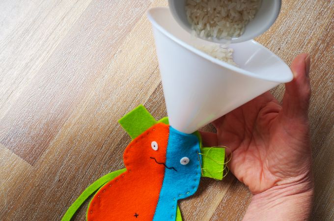 Fill the bottom half of her body with a granular weighting material. I’ve used dry rice grains. Millicent tells me they tickle as I pour them in. She likes that.