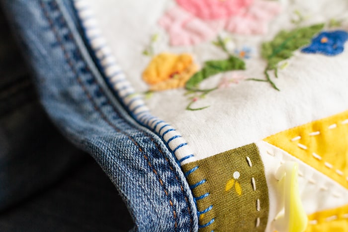 Now I trim my patch down to leave at least a quarter inch around all sides, then I’ll take my sashiko needles and some thread to do a little hand quilting on my patch before sewing it onto my jeans. You can definitely stitch the patch after it’s on the jeans but it will be a bit harder to get through all those layers.