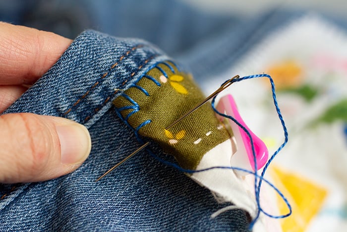I’m securing my patch onto my jeans by keeping the edge rolled under and finishing with a blanket stitch around the edges. I’m using purl cotton thread, two clover leather thimbles (coin thimble, natural fit leather thimble) and the sashico needles.