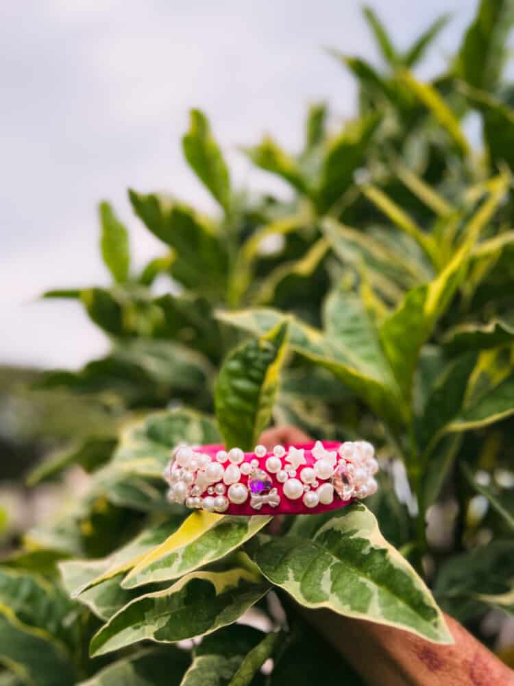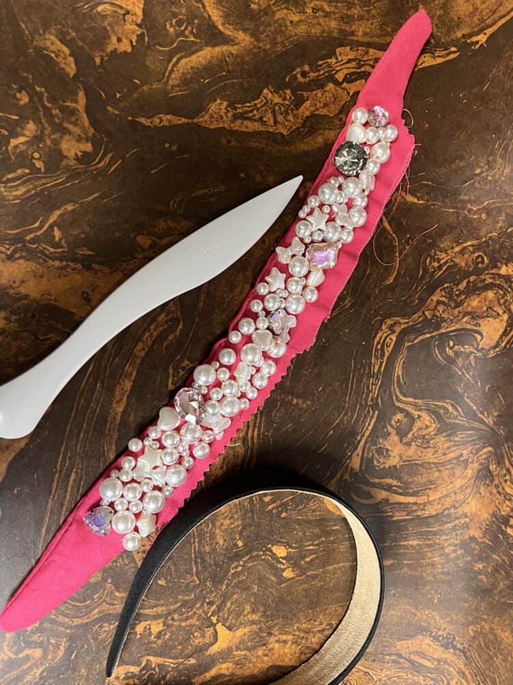 - Hand sew all the pearl beads and rhinestones (if you choose) onto your headband fabric from 2.5” in from each end. You can use a thimble here as well. Have fun organically organizing the design. This is where the exercise in patience kicks in. I promise it’ll be worth it!