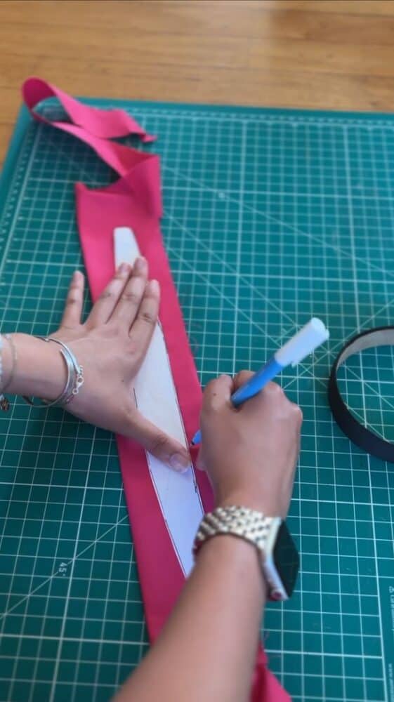 - Fold your fabric in half horizontally (so you’ll be working with two layers) and place your pattern piece on top. Use a water erasable pen to trace the pattern onto the fabric.