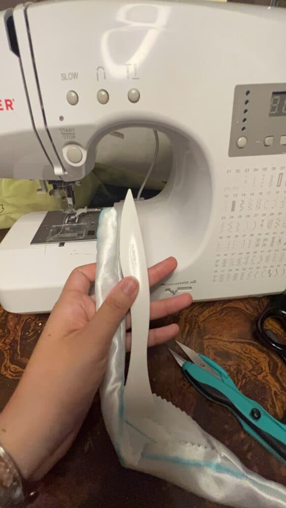 - Use a point turner to turn the fabric right side out, carefully pushing out the rounded ends.