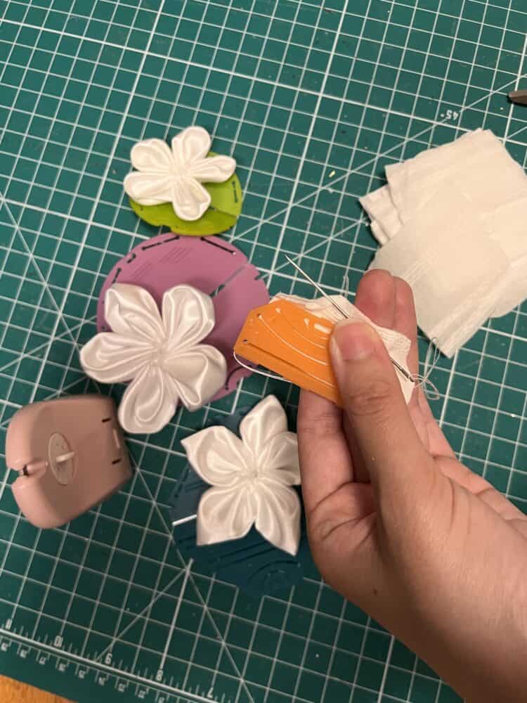 - Prepare the flowers by using the kanzashi flower maker templates and following the provided instructions. I needed to make 6 flowers to cover the width of my headband, while also maintaining a space about 2.5” on each end AKA the “no flower zone” (the space is to accommodate the ears).