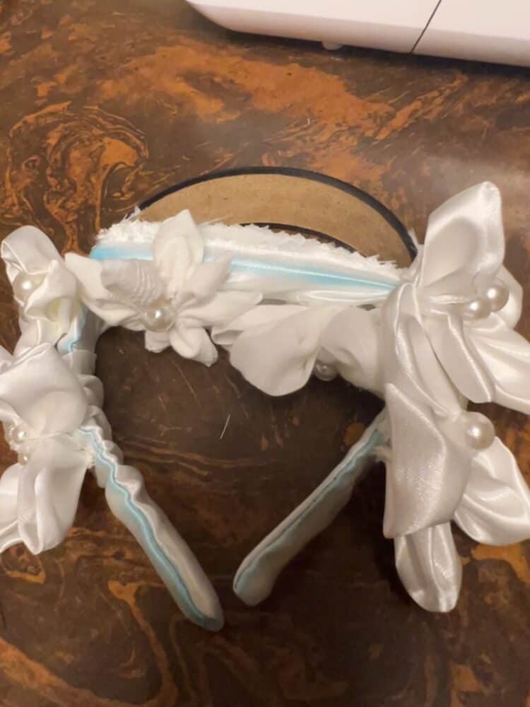 - Hand stitch the flowers to the headband cover main fabric using a needle and thread.