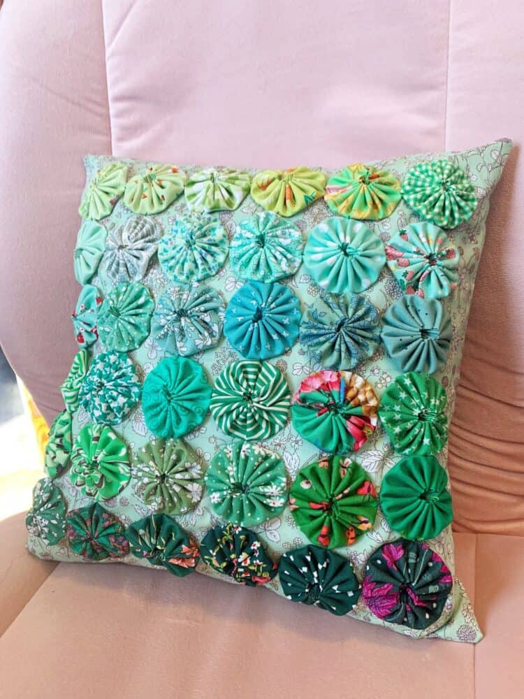 Once yo-yo’s are attached, make the edges of the pillow back. Fold a long edge over by 1/4 inch and fold over again, press and sew to make your pillow edge. Repeat with second back panel.