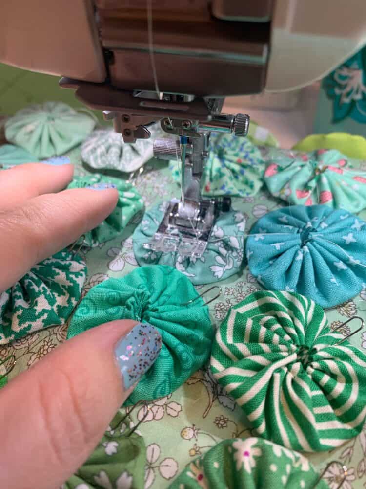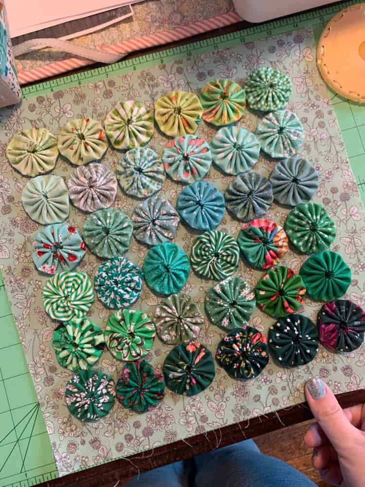 Cut 36 circles out of the scrap fabrics using the yo-yo maker as a template. Follow the directions on the pack to make the yo-yo’s. I find yo-yo making to be so relaxing and a very enjoyable project to do while watching a show. I even brought a bunch to do while waiting in an airport last month.