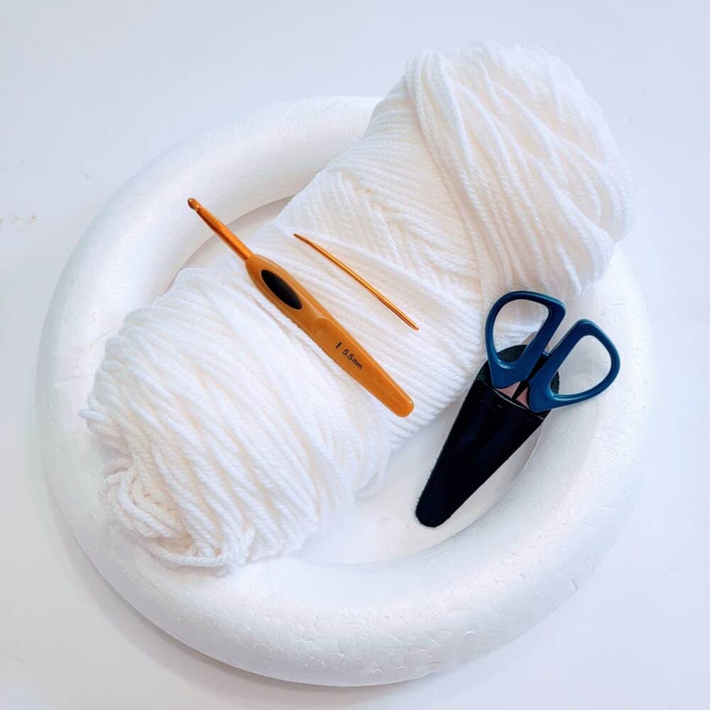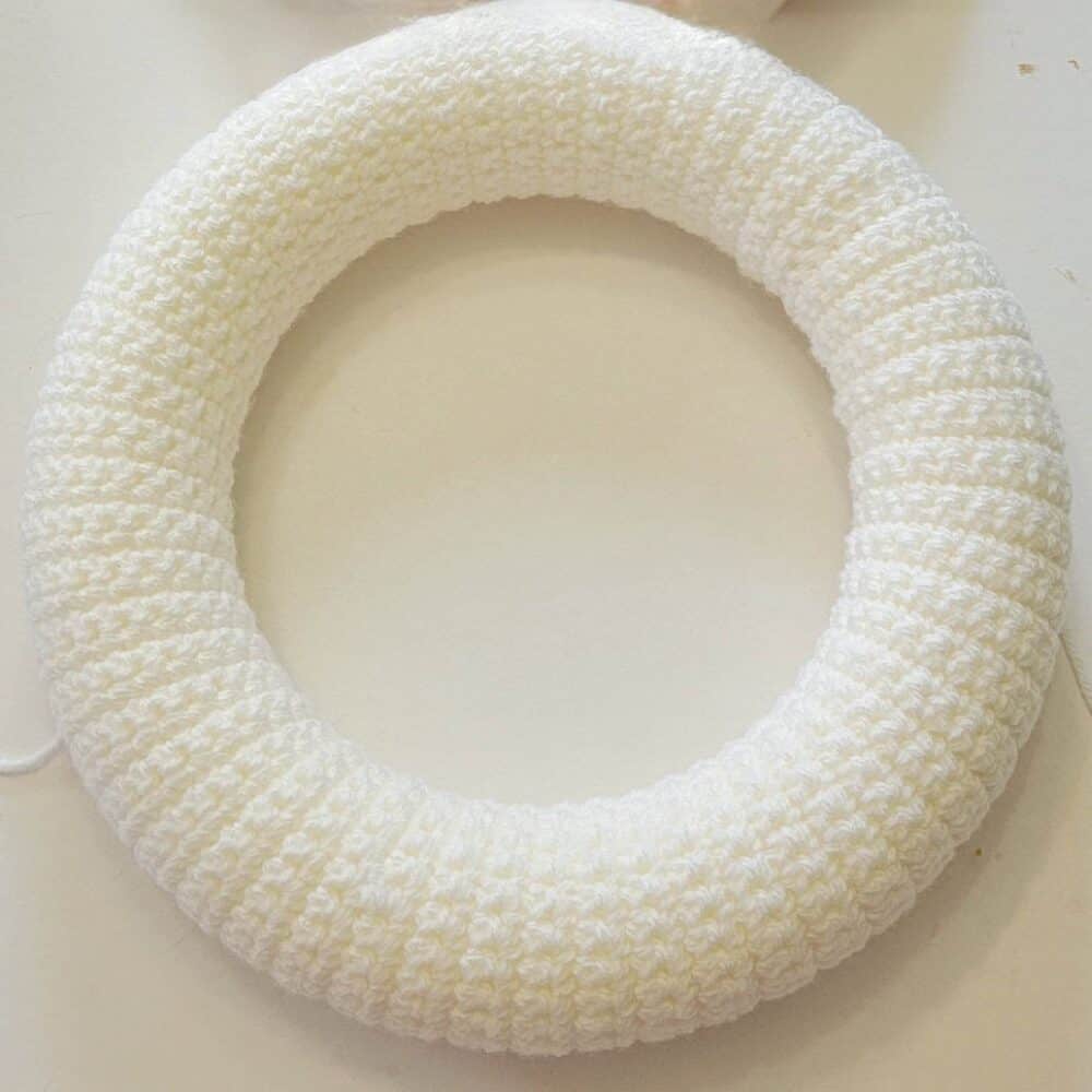 Time to cover up our foam wreath form. To do this, thread a long yarn through your darning needle. With RS facing out, place your crocheted piece over the wreath form then insert the needle to the 1st and last sts of R1. Continue sewing until you reach the end row (R112). Once you’ve completed sewing the tube, let’s close it up by connecting the 1st and last row. Fasten off and weave in all ends. Please see the photos below for your reference.