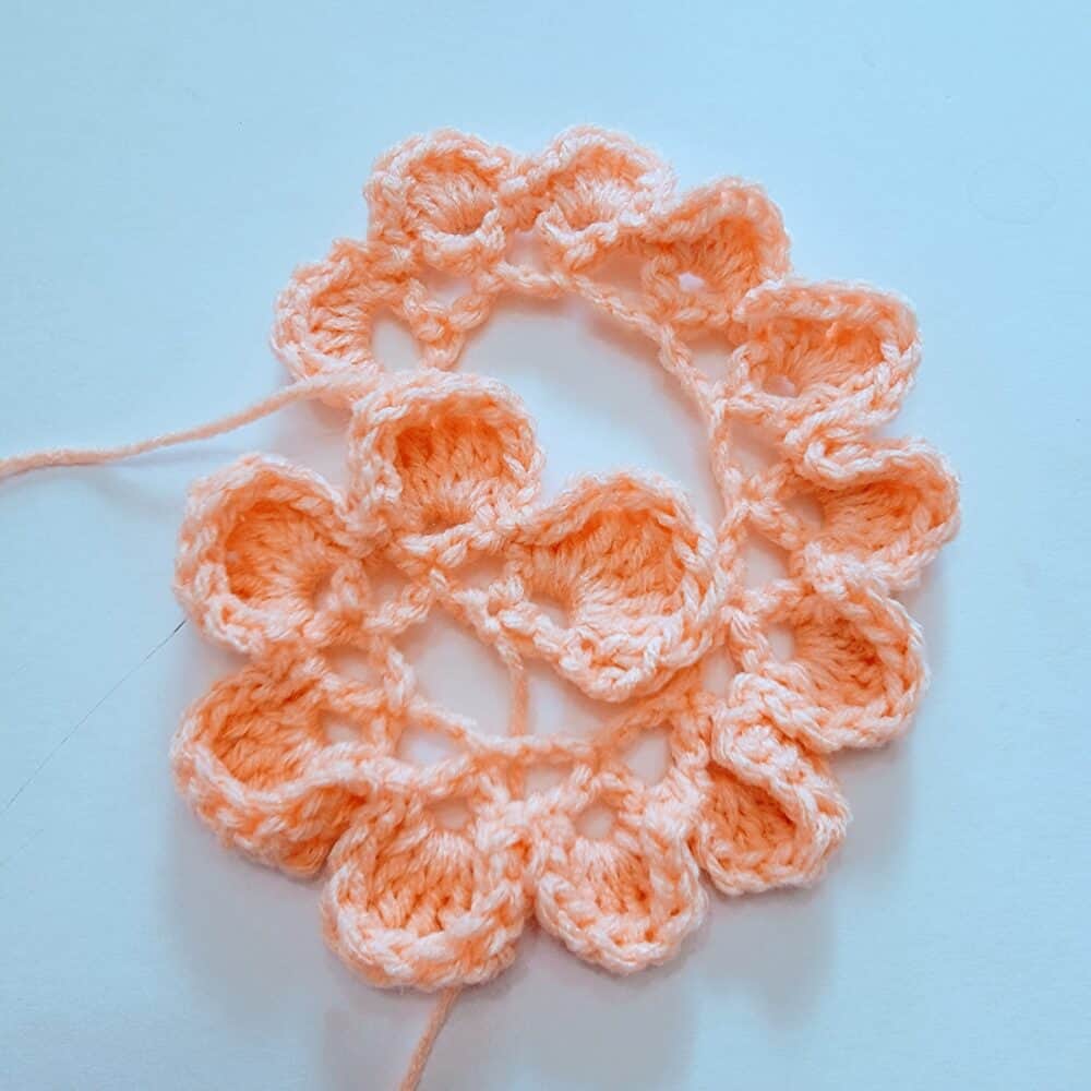 R2: a) [Ch 2, (DC, TR, 4 DTR, TR, DC) in next V-st, ch 2, sl st in between V-st sp] 5 times,