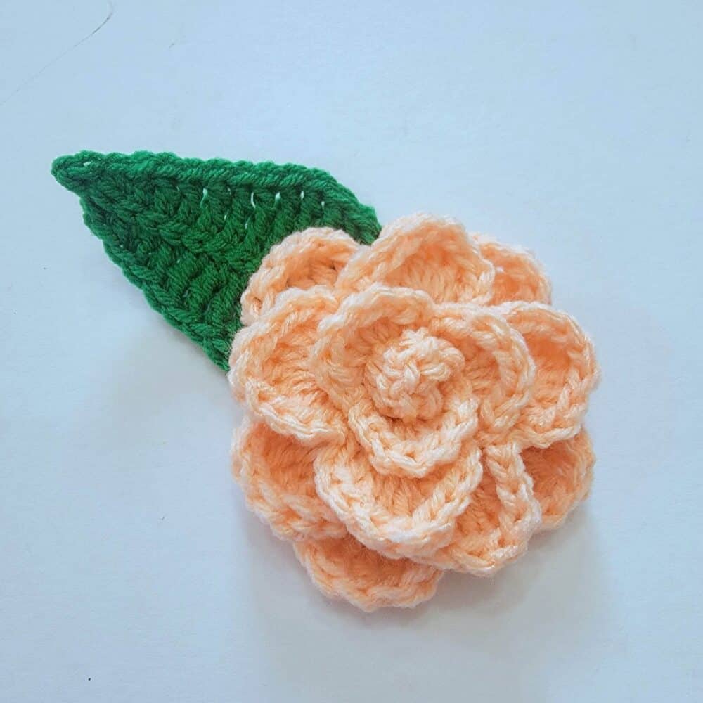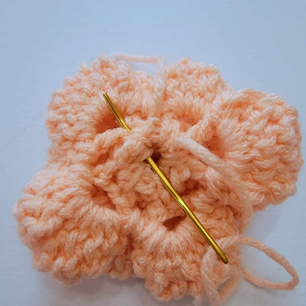 Now. let’s form the petals together to make a flower. With your last petal made as the center of the flower, roll each petal clockwise until you form a very nice flower. And with the long yarn tail thread through your needle, secure your flower by going through possible loops that hold every petal. Please see the photos below for your reference.