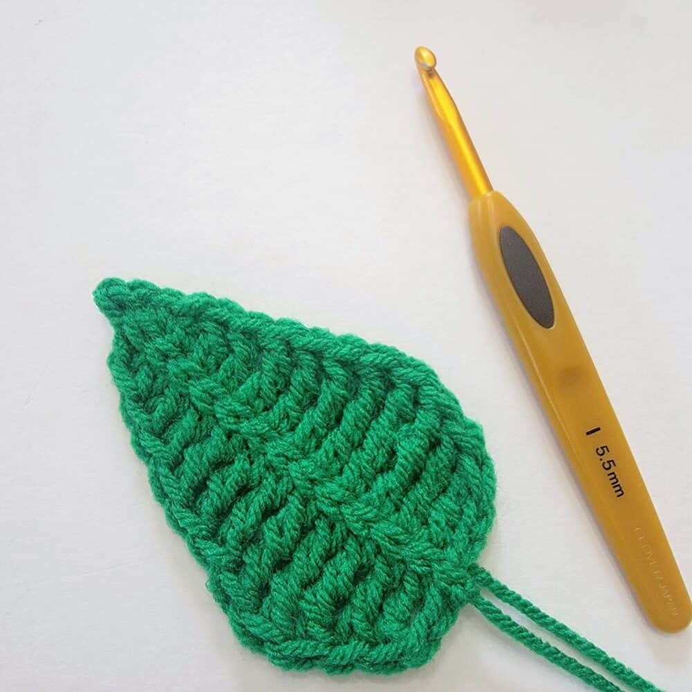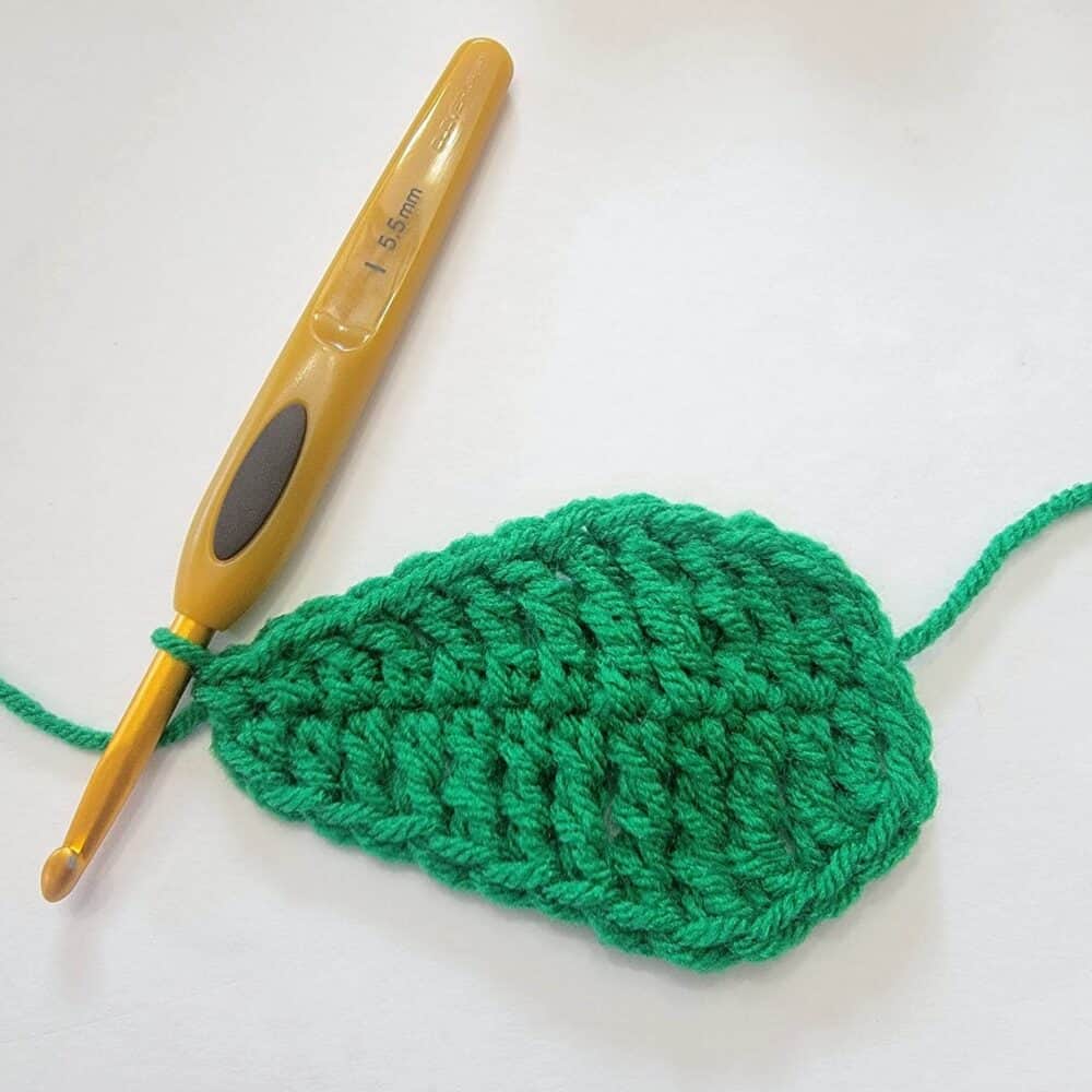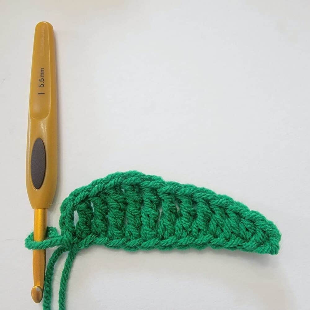 With green yarn, ch 13, SC in the 2nd ch from the hook, HDC in the next ch, DC in the next 2 chs, TR in the next 3 chs, DTR in the next 3 chs, TR in the last 2 chs, ch 2 and sl st in the last ch. DO NOT turn as we will be working on the opposite side of the foundation chs. Now, ch 2, TR in the next 2 chs, DTR in the next 3 chs, TR in the next 3 chs, DC in the next 2 chs, HDC in the next, and SC in the last ch. Next, SC in the very first SC and ch 1. Then, sl st into each foundation ch (middle section of the leaf) across. Fasten off leaving a long tail for attaching to the wreath. Please see the photos below for your reference.