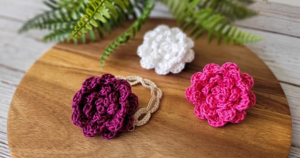 You can crochet the flower with the Size 10 thread and the smaller hook and it will come out about half the size of the flowers crocheted with the Size 3 thread – I think this smaller size would make a pretty pin or earrings.