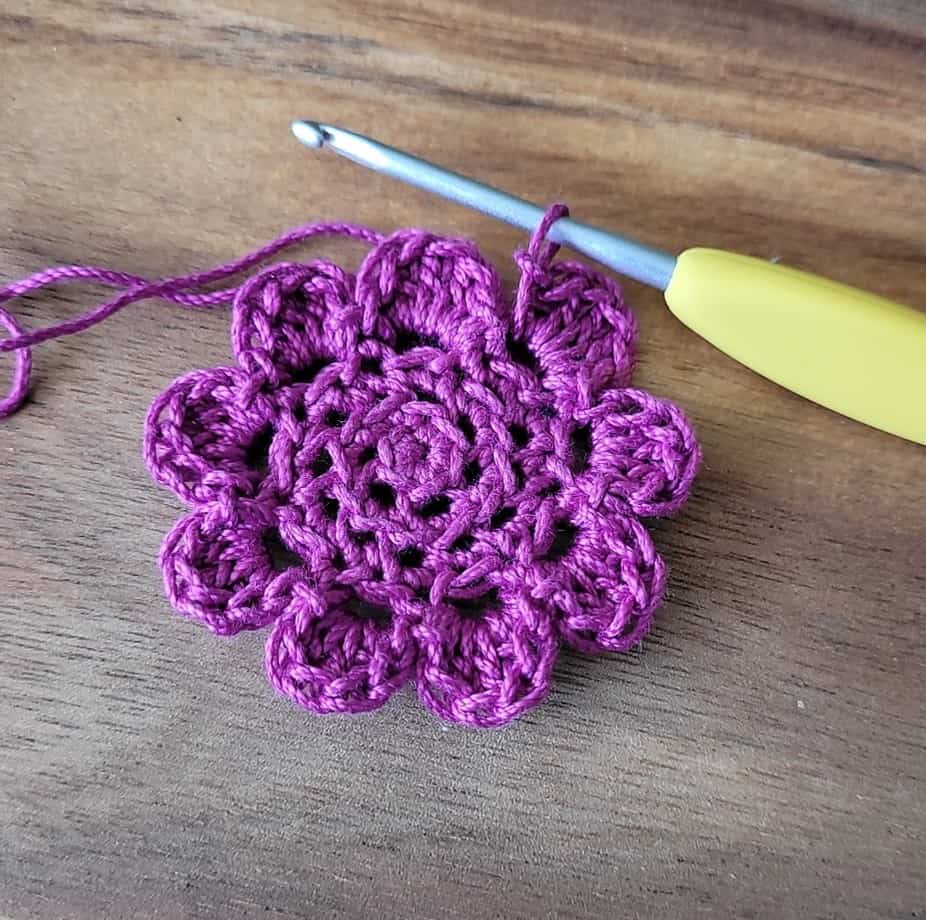 This is what your flower should look like after completing Round 5 – now you will start to work in front of the petals that you just crocheted and fill-in the center circle of the flower