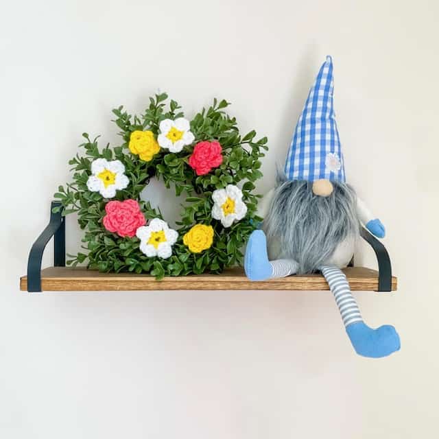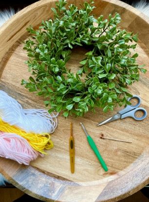I love using crochet to personalize something we already have at home or something inexpensive from a dollar section to make it more unique. Adding crocheted flowers to something always makes me happy, so today I’m creating a floral wreath with bright, springy vibes!
