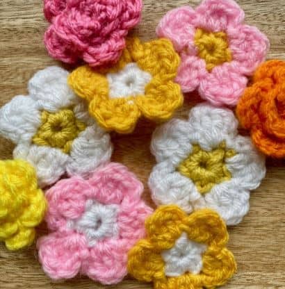 Daisy Flowers: Using color of your choice, make a magic circle or chain 2 with 9 scs. Join with a slip stitch. Attach a new color to make the petals. All in the first stitch: Ch 2, 2 dc, ch 2, and slip stitch. This completes the first petal. Ch 2 and skip a stitch. In the following stitch repeat: *ch 2, 2 dc, ch 2, and ss*. Ch 2 and skip a stitch in between petals. Repeat around until you have 5 petals. Tie off and weave