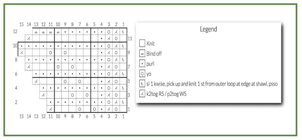 Row 10: P12, yo, p2tog, sl 1 kwise, pick up and knit 1 st from shawl edge, psso. (15 sts)