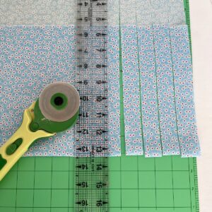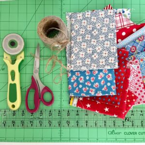 Step Three: Lay each fabric piece on the Clover cutting mat and use your Clover rotary cutter with a sharp blade to cut four strips one inch wide by 18 inches long. (If you plan to make more than one bunting, you can double this amount.) Continue cutting until you have 4 strips from each of the 12 fabrics with a total of 48 strips. (If you use fewer fabrics, just make sure that you cut 48 strips.)