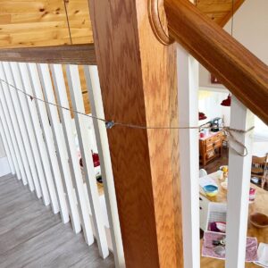 Step Five: Find a place to tie and hang your twine so that it’s easy to work with. I chose the landing at the top of my stairs and tied each end to the stair rails. You’ll want to tie it firmly because as you add the fabric strips it’ll sag.