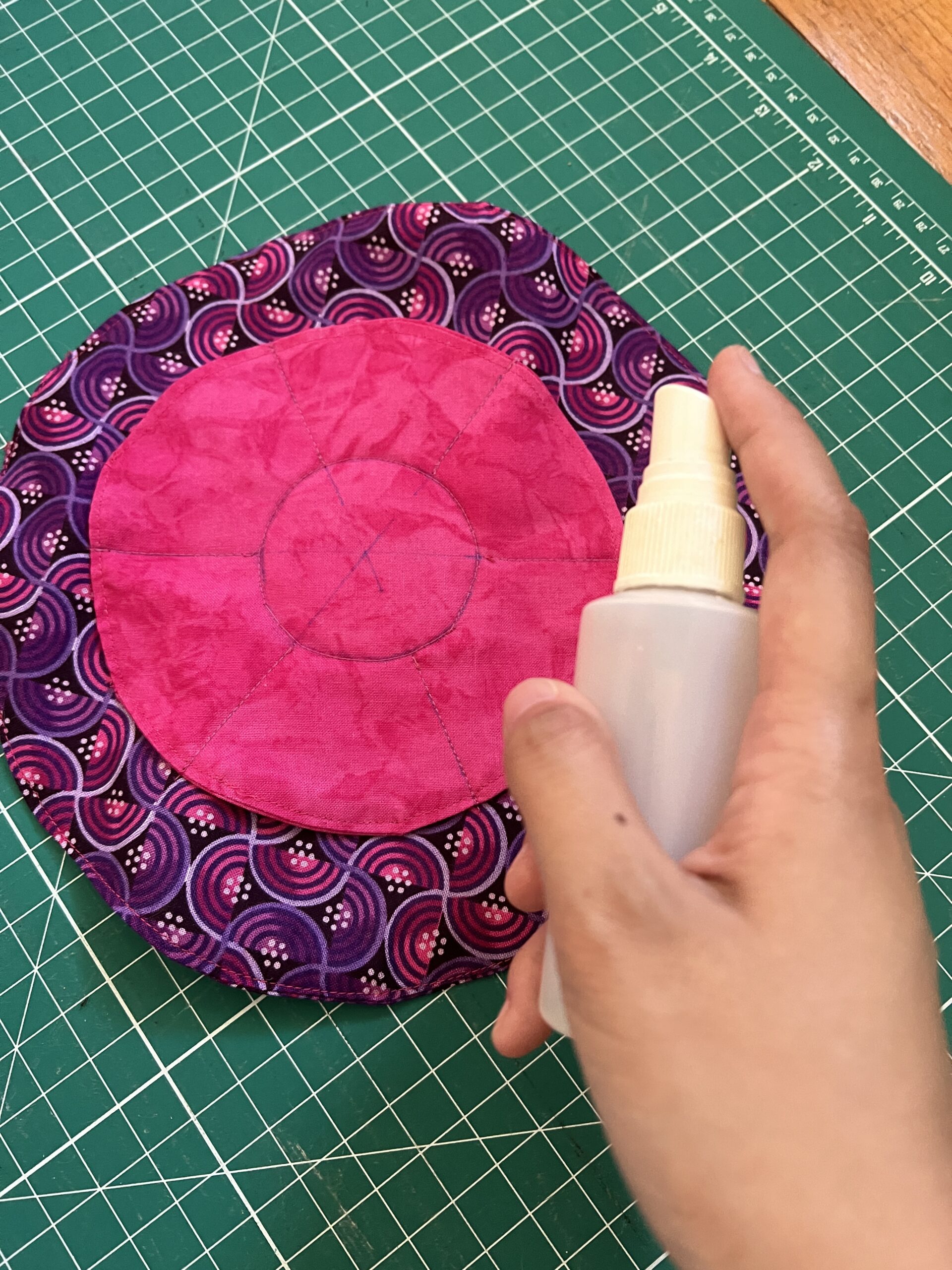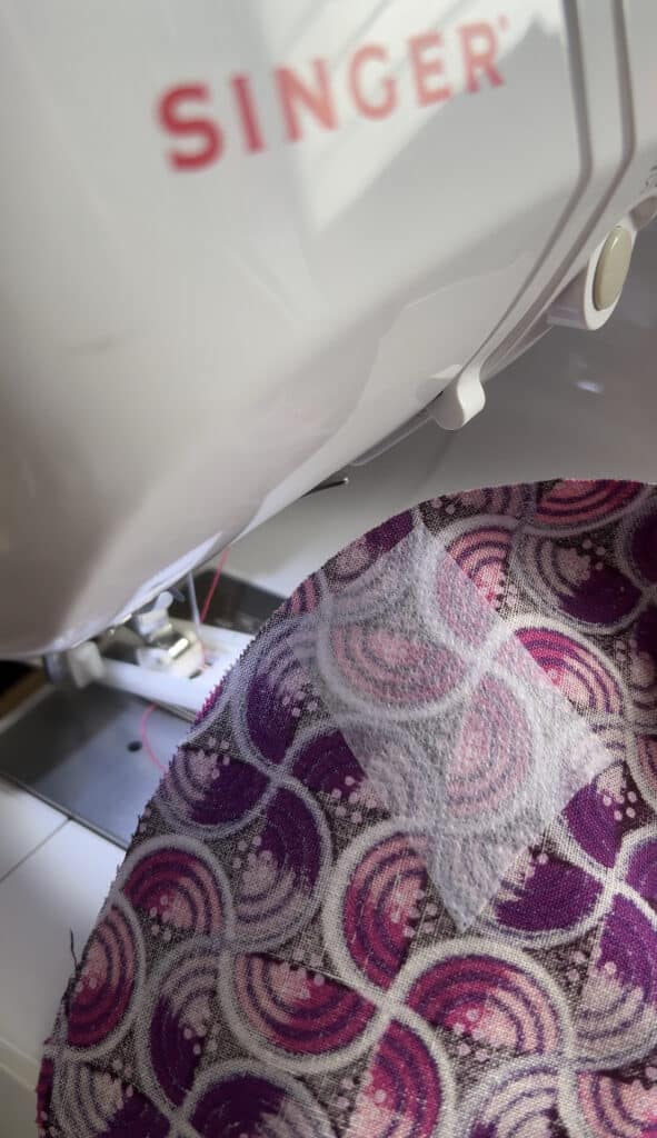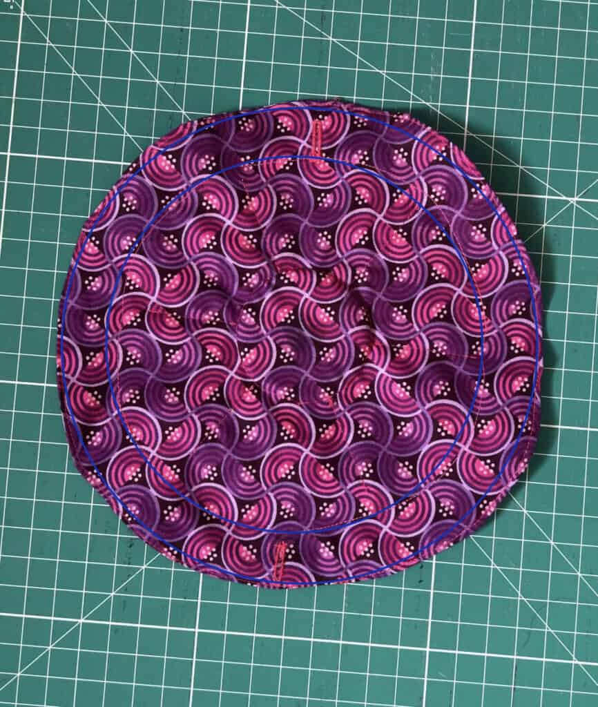 10. From the base of the cardboard circle, stitch along the 6 drawn guidelines to create the actual inner pockets of the jewelry holder. Make sure to backstitch at the beginning and end!