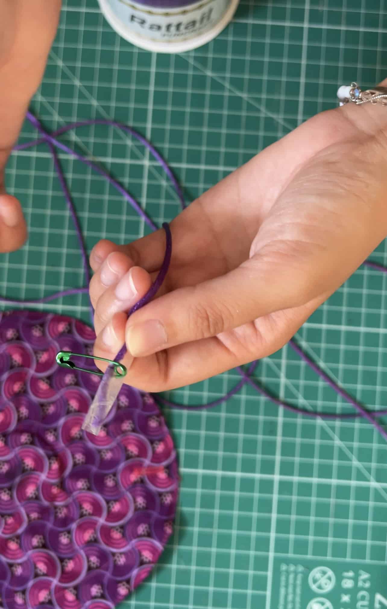 he safety pin to avoid fraying. You can always trim the ends later. Repeat with remaining cording.