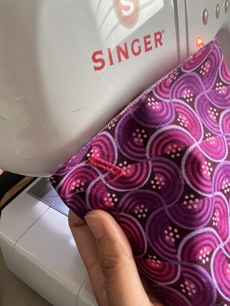 5. Place the inner pocket pieces right sides together using clips and sew together with a 0.5cm seam allowance, make sure to leave a gap around 1.5” long so you’ll be able to turn the fabric right side out.Â