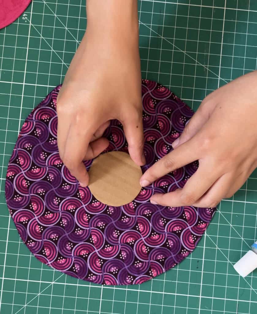 7. With the buttonhole side of the main body face down, use a light amount of fabric glue to secure the cardboard piece to the center of the main body.Â