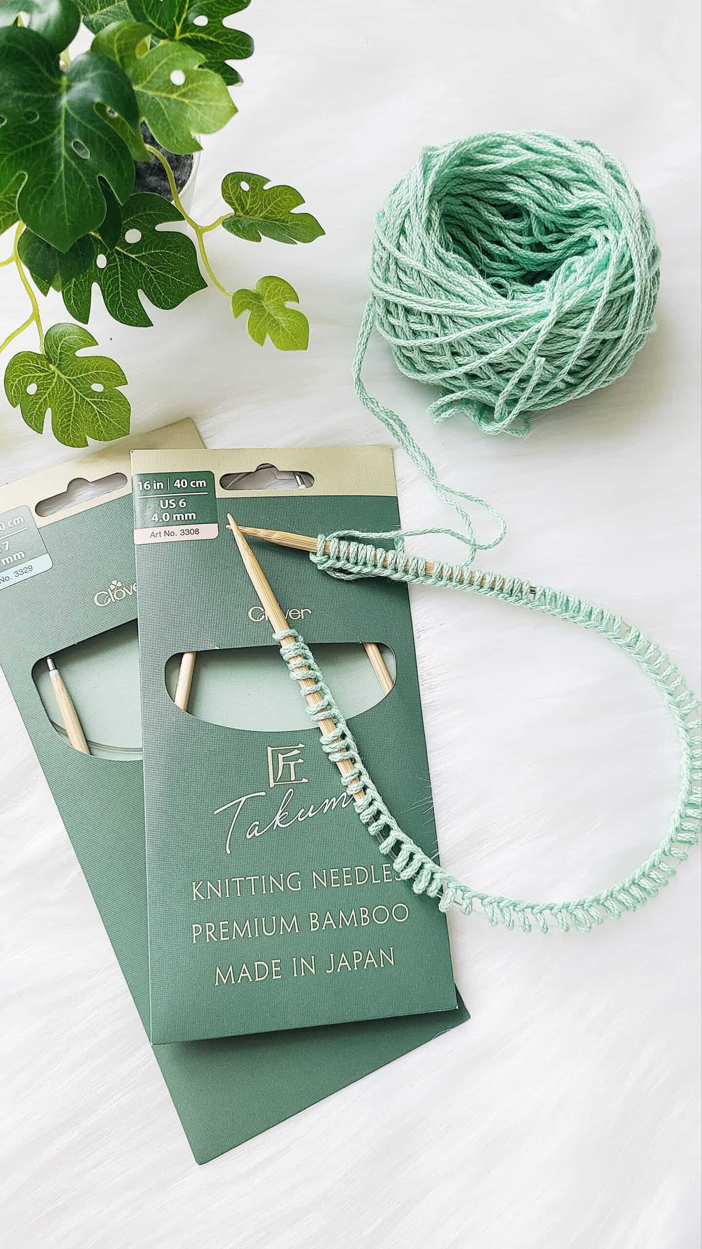 For this, you’ll need any size circular needles and appropriate yarn for those needles. I used new 4.5 mm PRO Takumi bamboo circular needles and Lion Brand 24/7 cotton. This tutorial is geared towards right-handed people and teaches the English knitting style. Let’s get started!