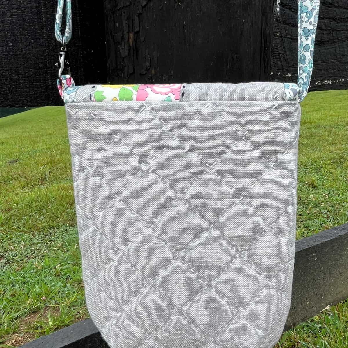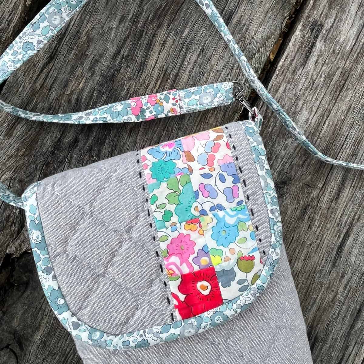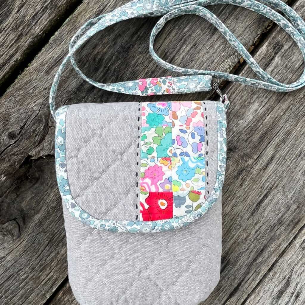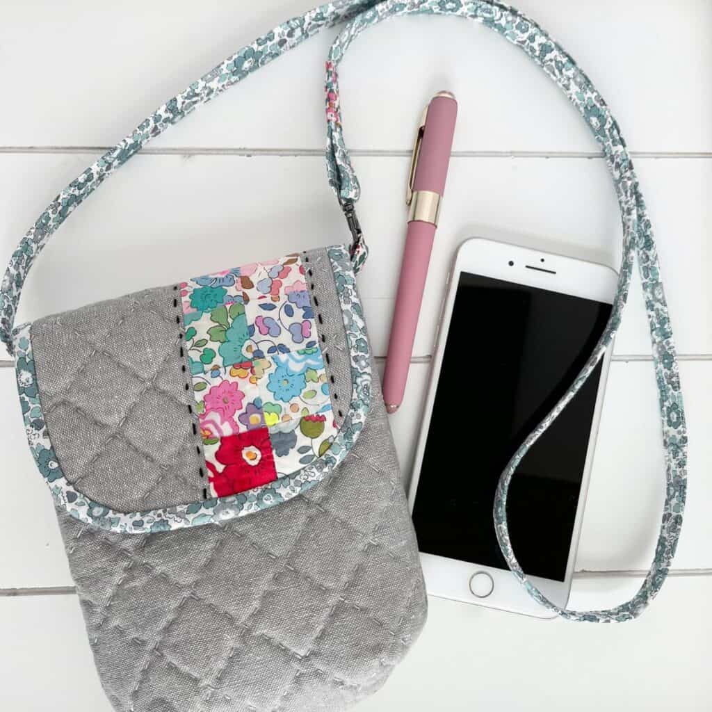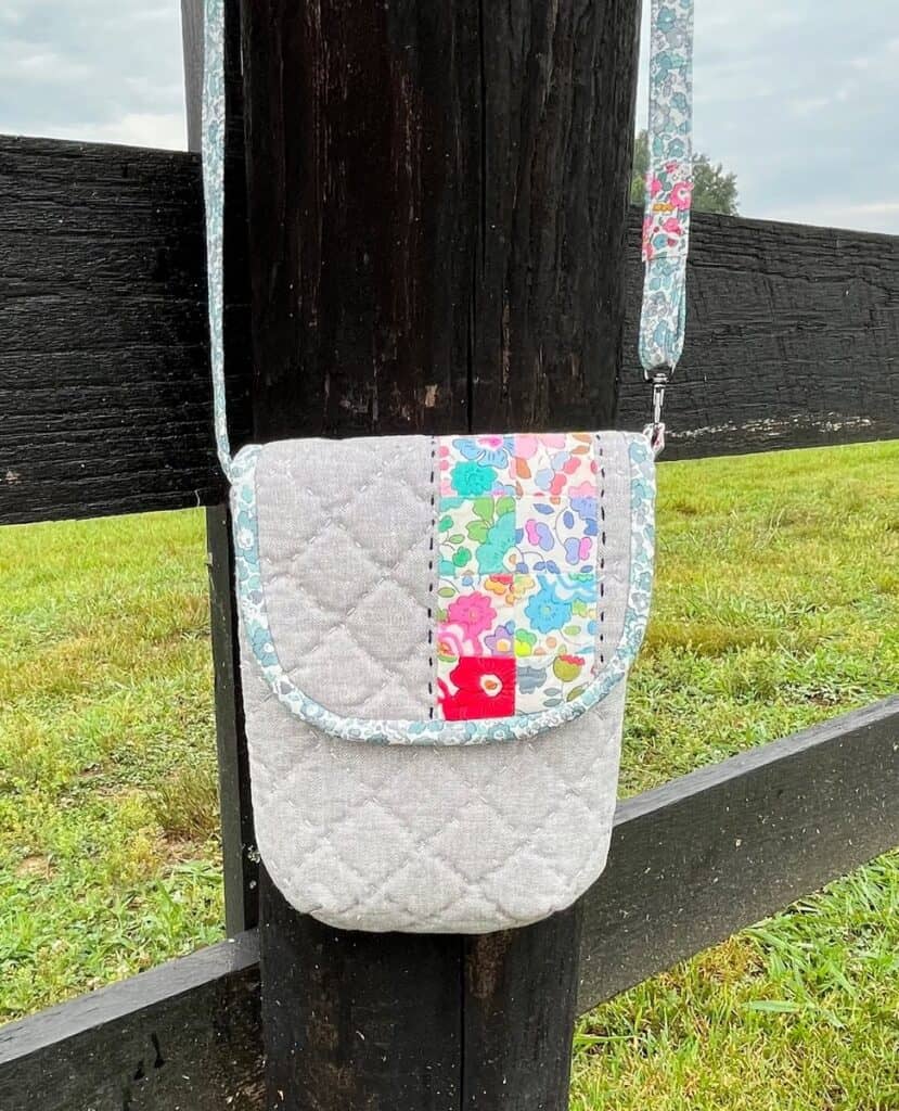 I really love how the hand quilting came out. It might be my favorite part of the bag. One thing about the pattern that I really appreciated was that the quilting lines on the front flap lined up perfectly with the quilting lines on the bag front. You can see that in the middle photo below. This bag is such an awesome size and easily holds a phone, sunglasses, keys and a little coin purse. We are taking our granddaughters on a little road trip next week and I’m super excited to use my bag! It will hold all my essentials.