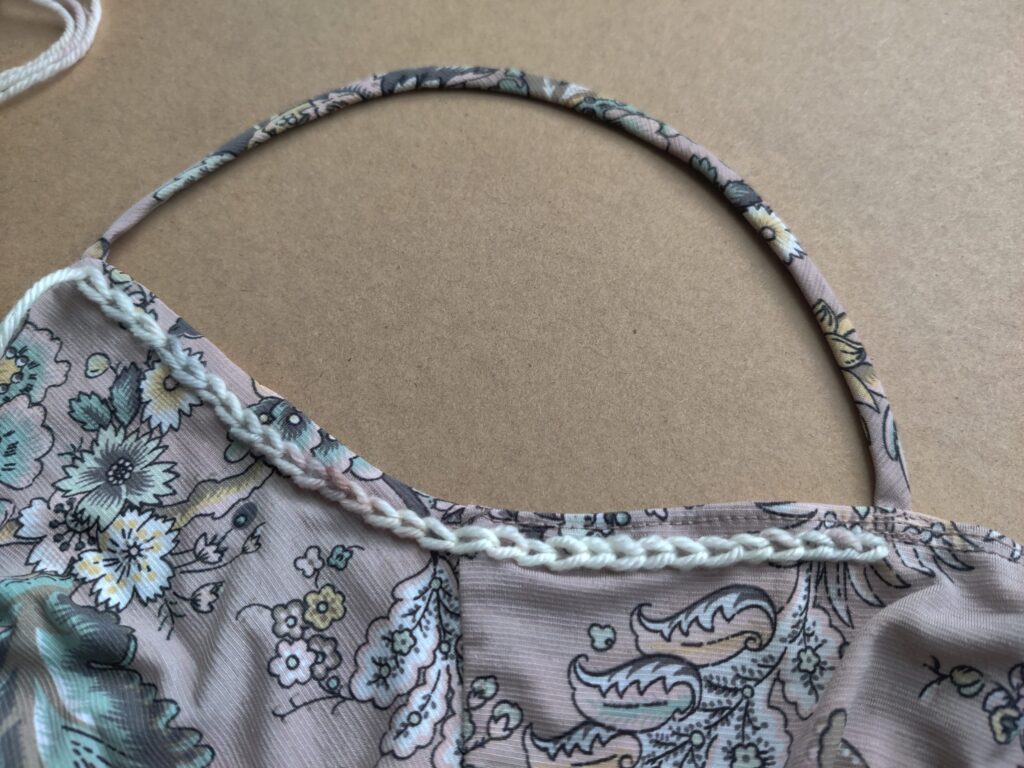Thread your embroidery needle with a long string of yarn. Bring the needle up through the back of the fabric, next to either cami strap, about a quarter inch from the edge of the fabric. From there, chain stitch across the arm pit area in between the front and back of your cami strap (each chain stitch NEEDS to be a quarter inch long so that you will be able to fit a 4.5mm hook through). Repeat this for the second arm pit area, making sure you make the same amount of chain stitches as you did for the first.