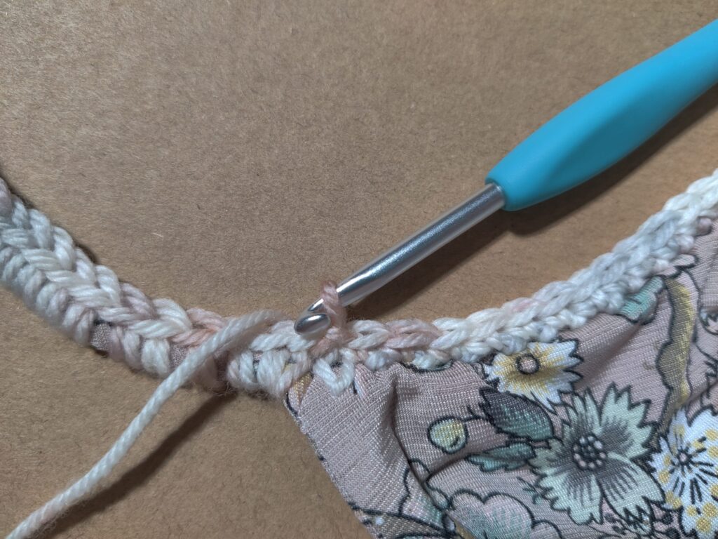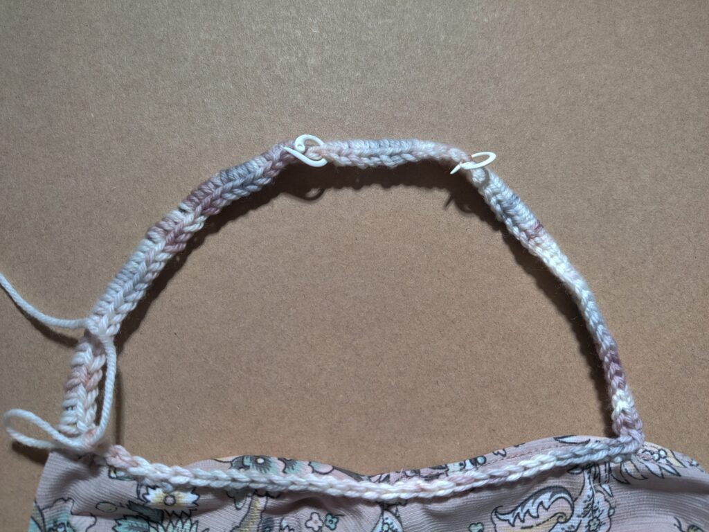 Row 1: Measure how long your cami strap is (mine was 12″) using a 4.5mm hook, attach yarn into the closest embroidered chain stitch to the FRONT of either cami strap, SC across the strap, making sure your stitches face outwards (towards where we will be creating sleeves and NOT facing the neck/shoulders area) Place 6 SC for every 1″ of the strap (My strap was 12″ long and 6 x 12 = 72 so I did 72 SC total across the entire length of my strap)