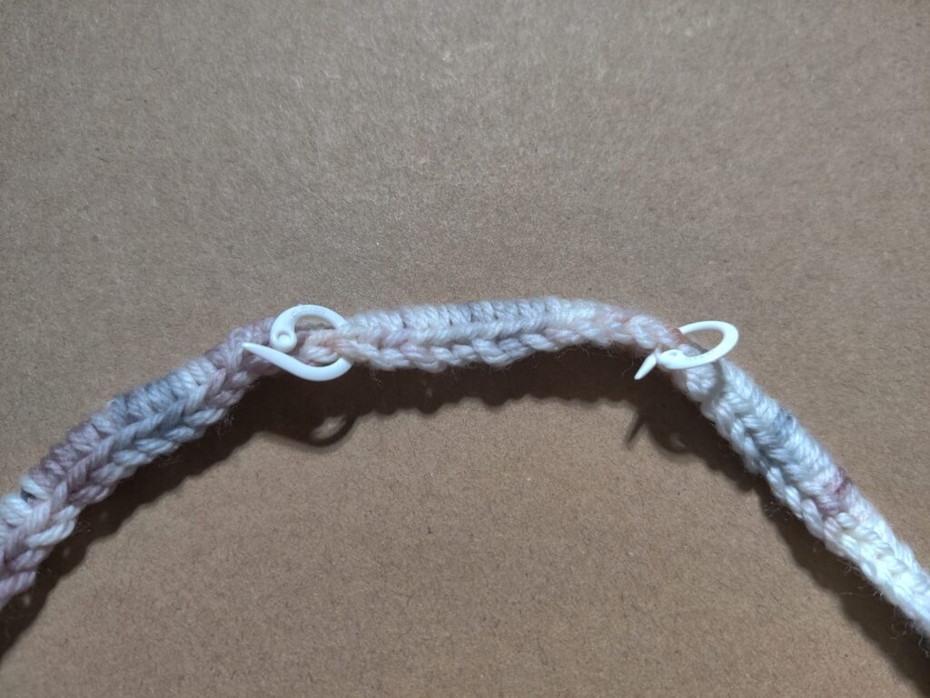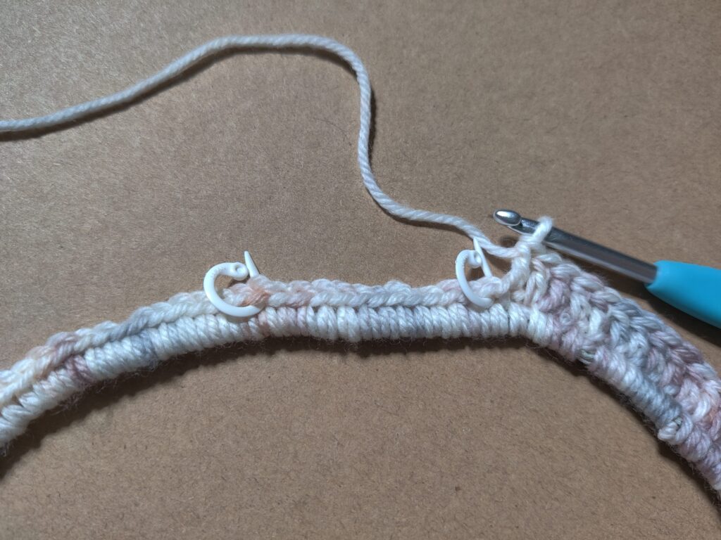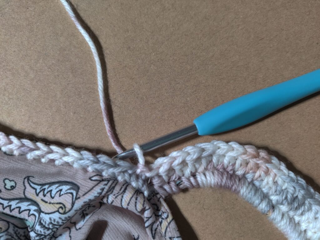 Repeat Row 3 until you have no more SC to Sl St into at the end. I had only one left rather than 2 (which isn’t enough to complete the sl st ending) so I placed 1 DC into the final stitch, and then did a Sl St into the very first DC from the beginning of the row.