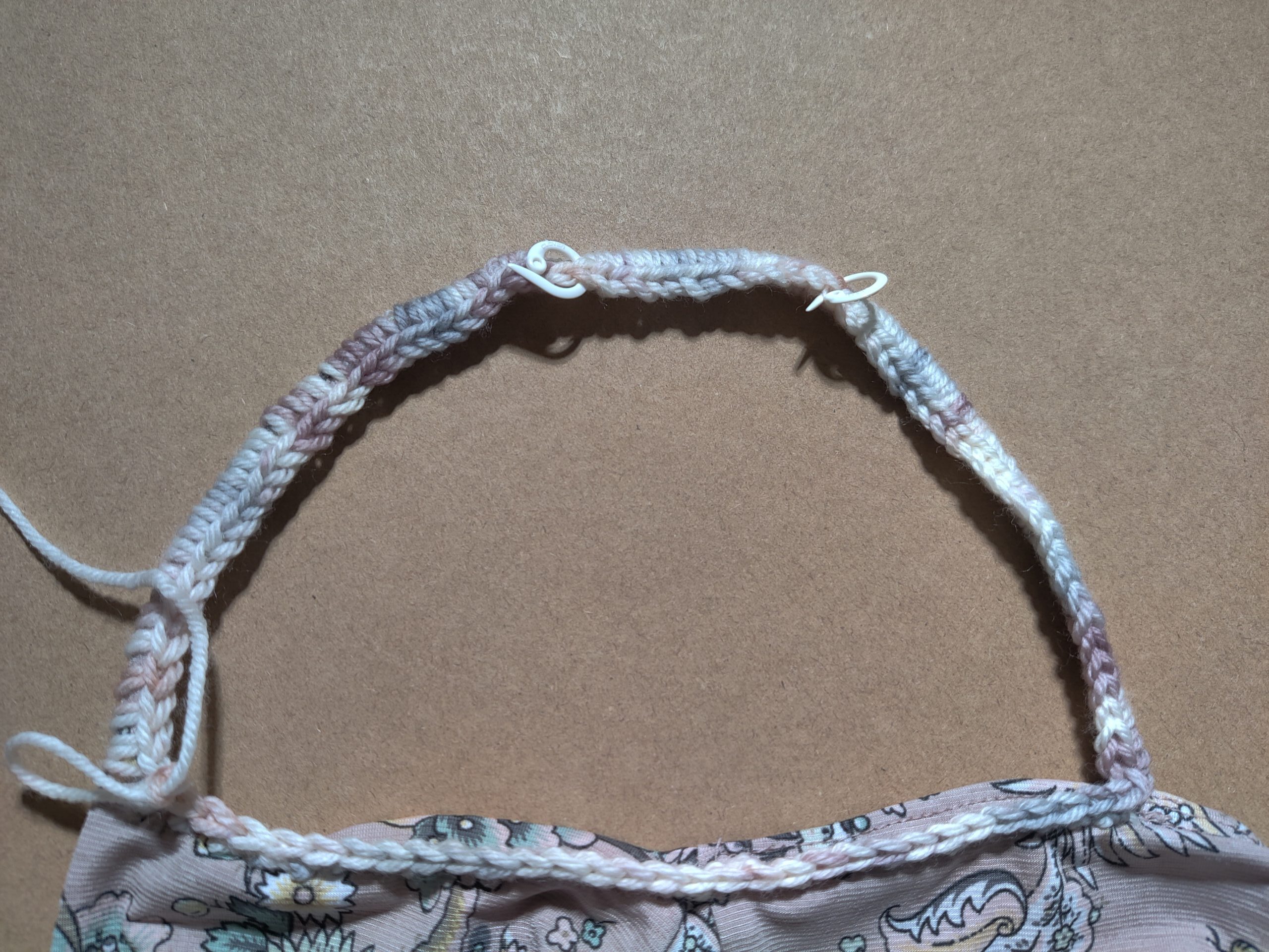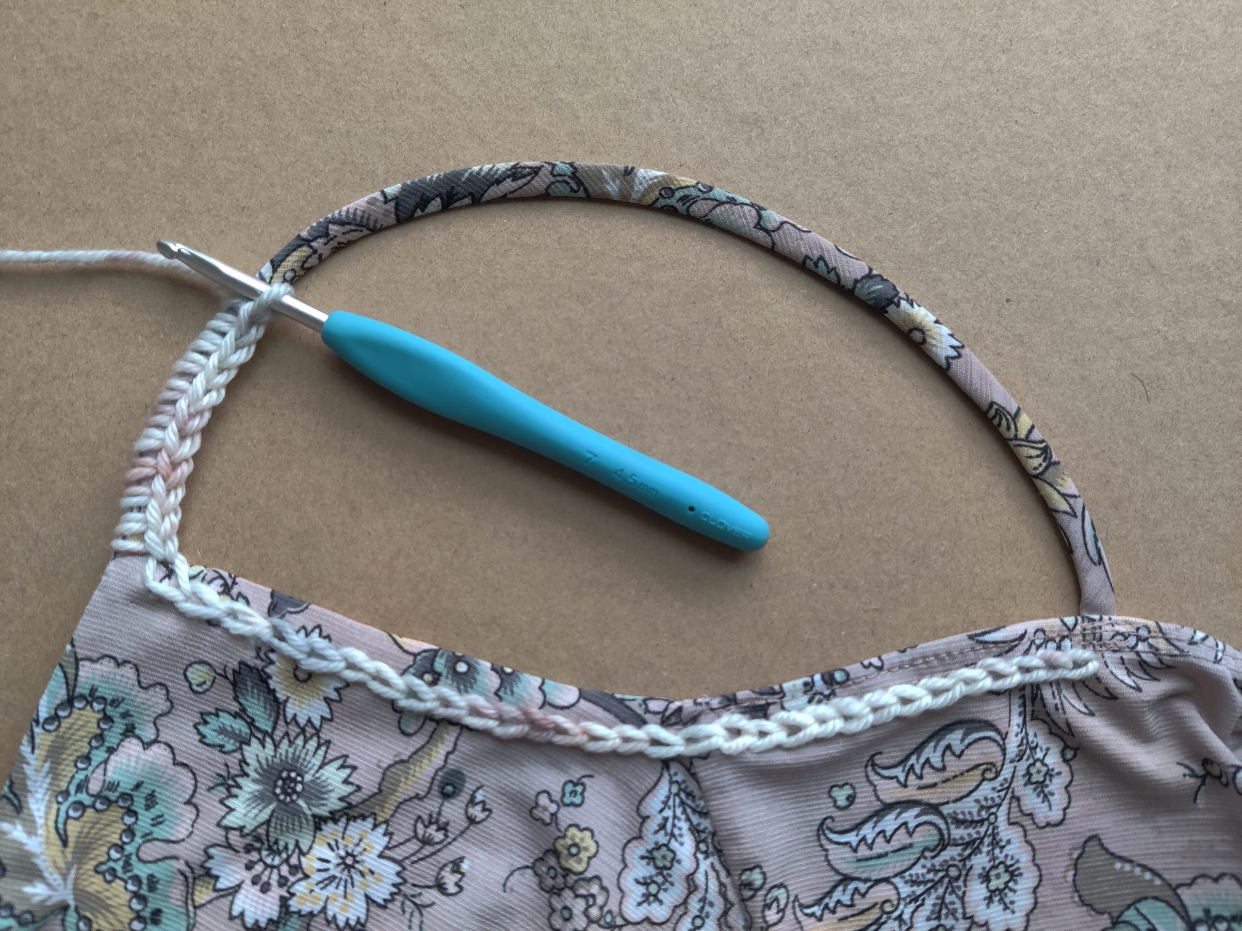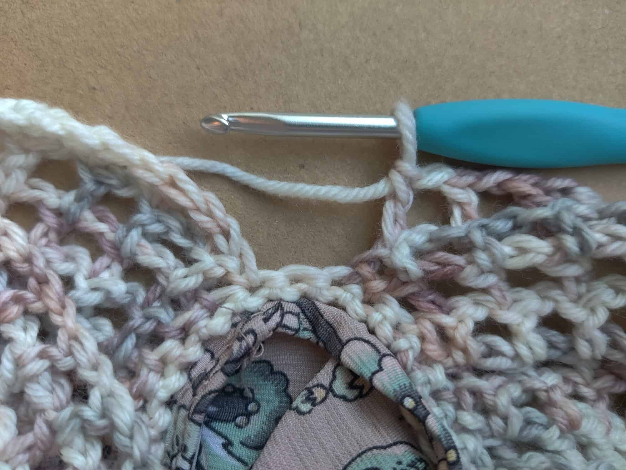 Thread your embroidery needle with a long string of yarn. Bring the needle up through the back of the fabric, next to either cami strap, about a quarter inch from the edge of the fabric. From there, chain stitch across the arm pit area in between the front and back of your cami strap (each chain stitch NEEDS to be a quarter inch long so that you will be able to fit a 4.5mm hook through). Repeat this for the second arm pit area, making sure you make the same amount of chain stitches as you did for the first.