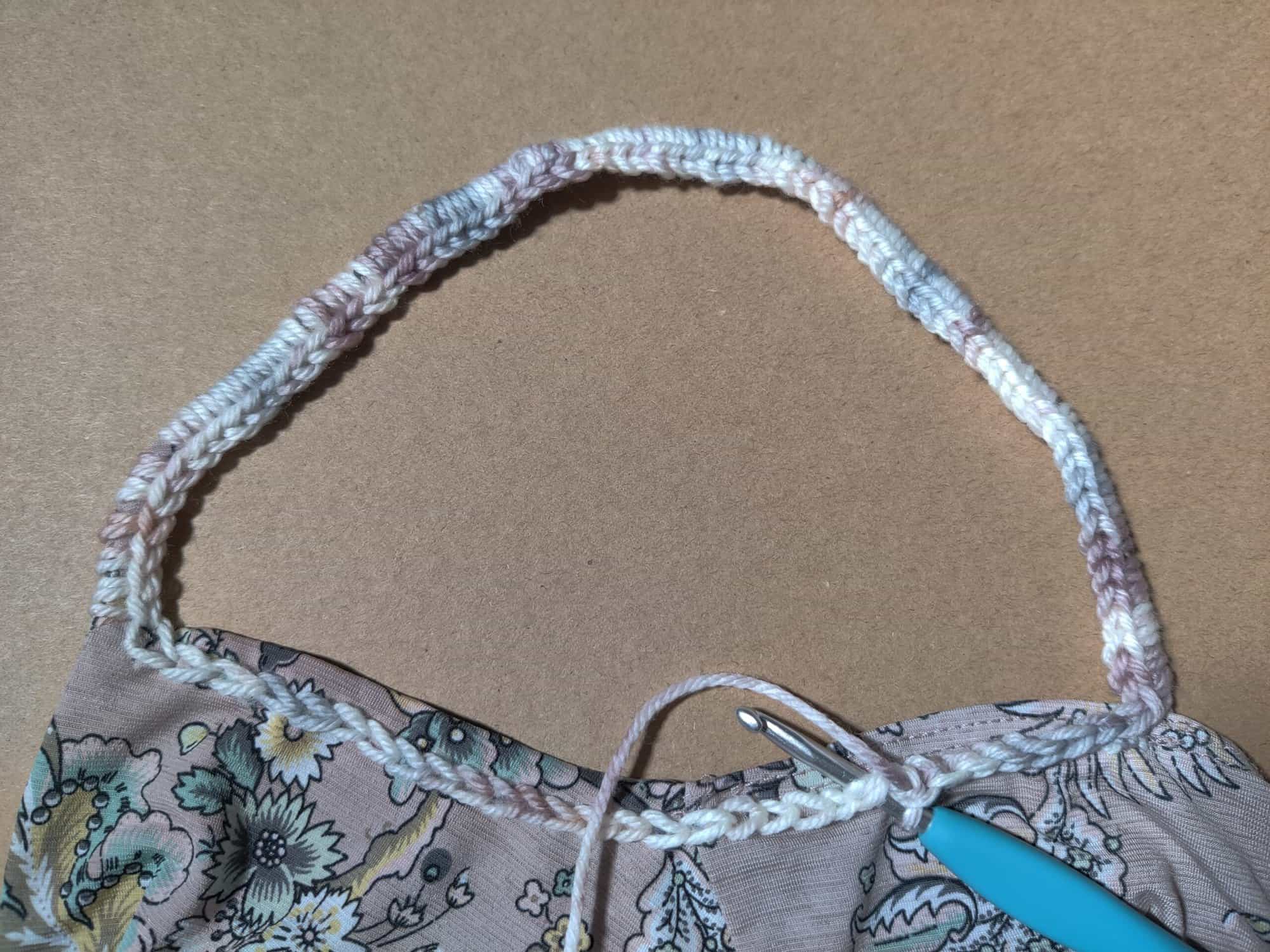 Row 1: Measure how long your cami strap is (mine was 12″) using a 4.5mm hook, attach yarn into the closest embroidered chain stitch to the FRONT of either cami strap, SC across the strap, making sure your stitches face outwards (towards where we will be creating sleeves and NOT facing the neck/shoulders area) Place 6 SC for every 1″ of the strap (My strap was 12″ long and 6 x 12 = 72 so I did 72 SC total across the entire length of my strap)