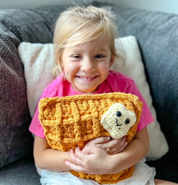 Hi everyone! My name is Molly, from @louloopsco on IG, and creating crochet foods has always been one of my favorite things. There is just something so cute and unique about it. This jumbo breakfast favorite uses none other than the waffle stitch. The waffle stitch is made in series of 3s, and alternates between each row. You can make the pillow even bigger as long as you add stitch counts by 3s. National Waffle Day is August 24th, so make sure to create this and show it off just in time!