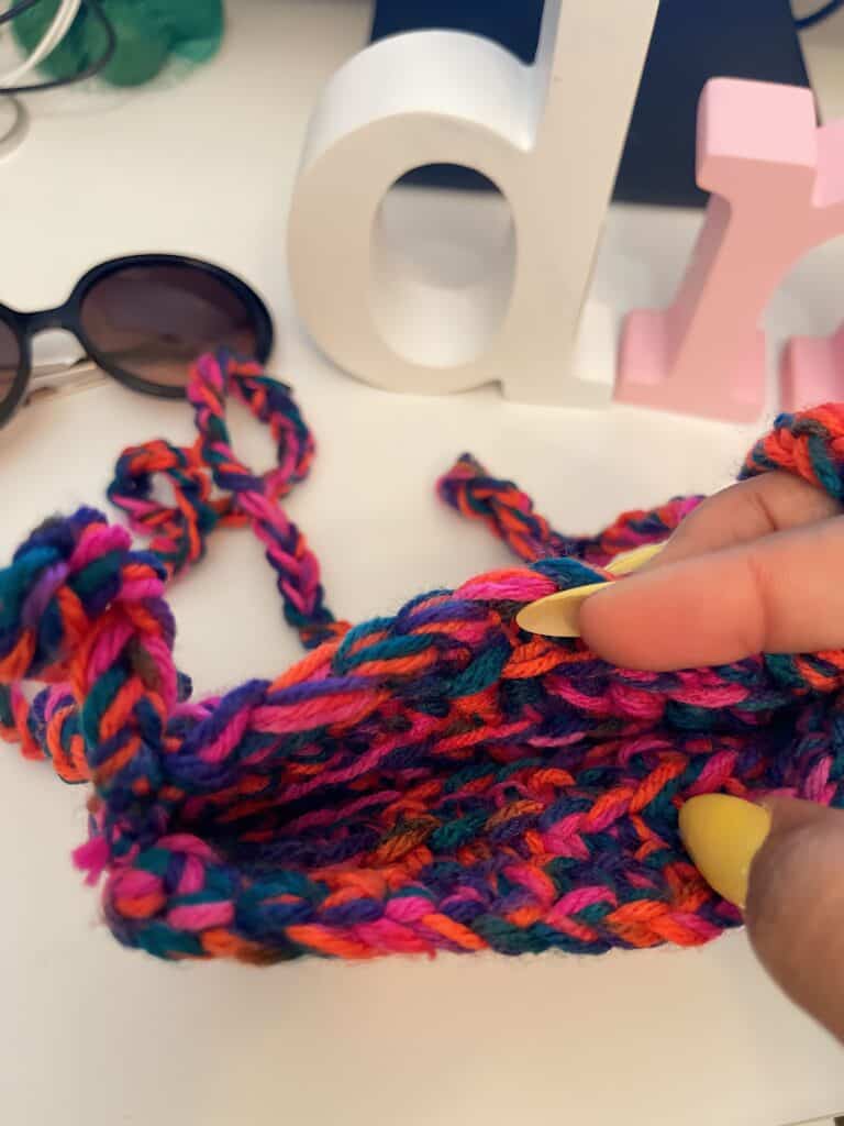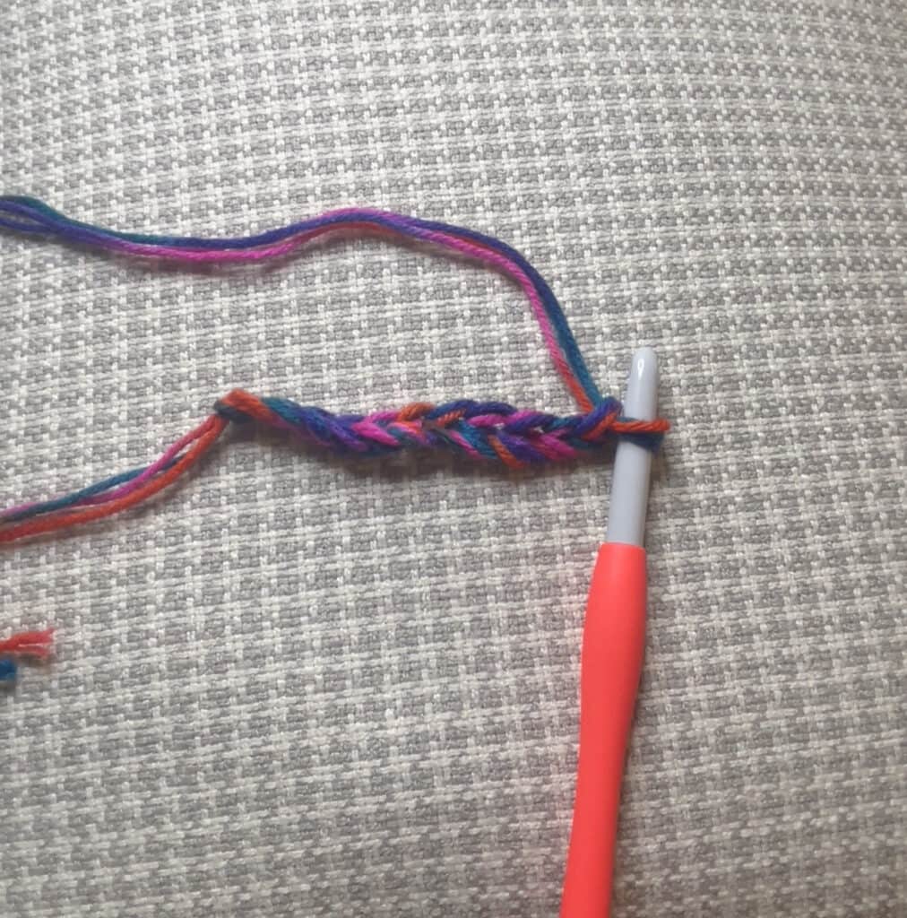 Then, create a foundation chain. The length of the chain should be the width of your bag. I did 13 chains, but you can do more or less. Keep in mind that the chain will stretch slightly, so make it a bit shorter than your desired width.