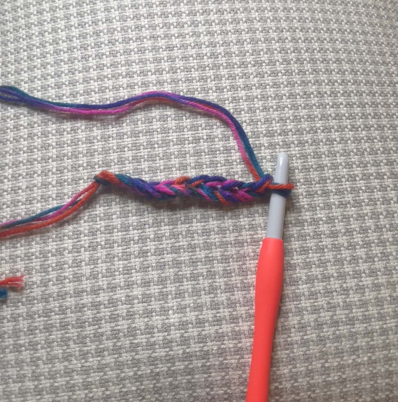 Create a slip knot using three pieces of yarn at a time (I do this for thickness).